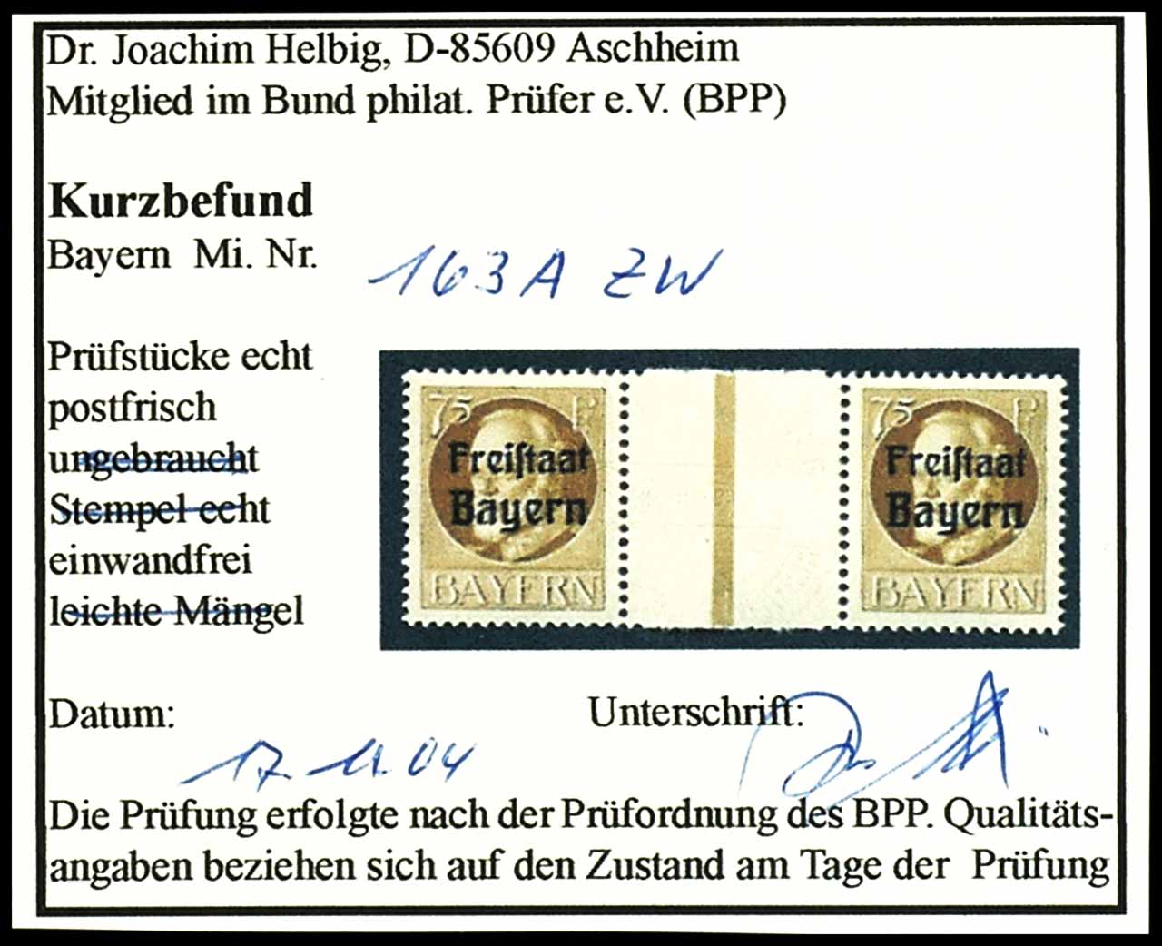 75 Pfennig König Ludwig III., gezähnt, waagerechtes Zwischenstegpaar, postfrisch, tadellose Erhaltung, unsigniert, Fotobefund Dr. Joachim Helbig BPP "einwandfrei"