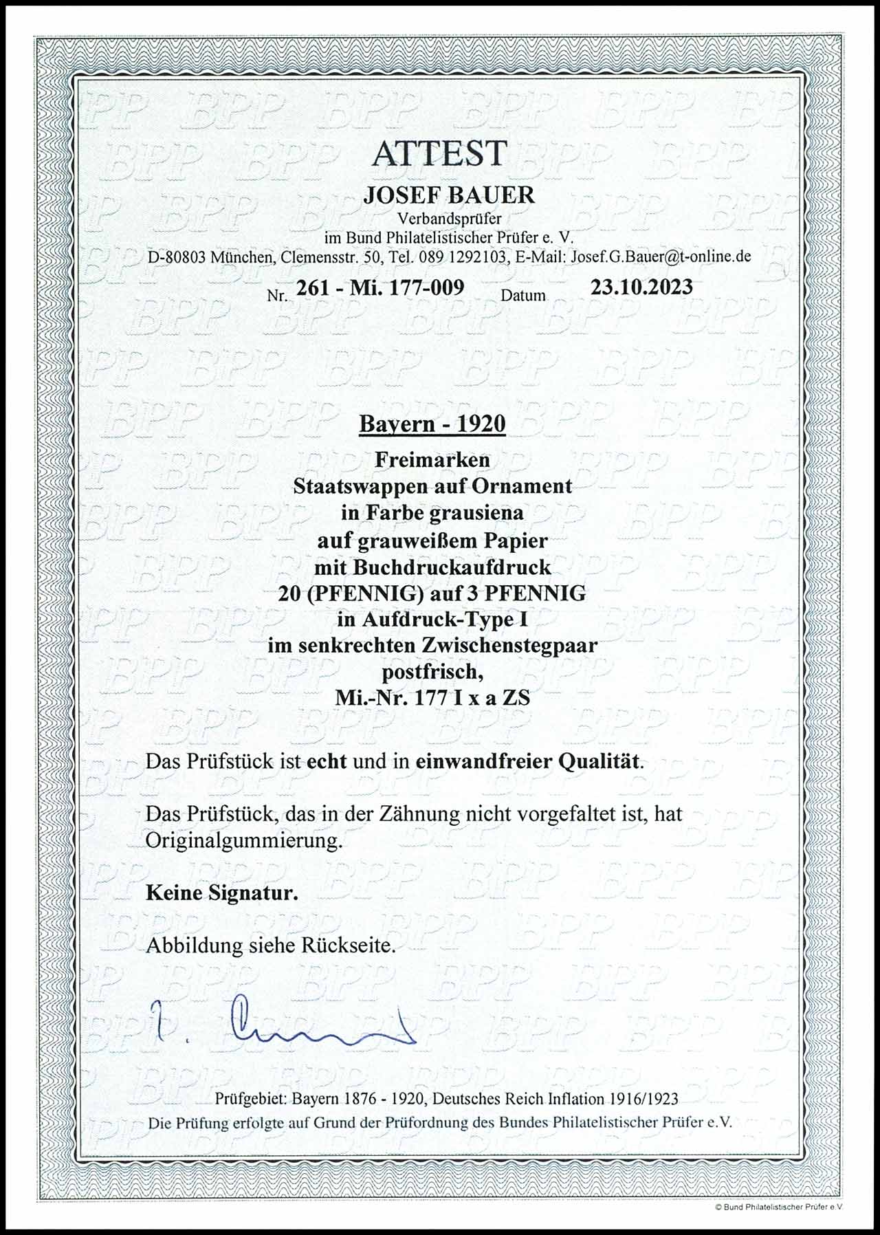 20 auf 3 Pfennig grausiena auf grauweißem Papier, Aufdrucktype I, senkrechtes Zwischenstegpaar, postfrisch, tadellose Erhaltung, unsigniert, Fotoattest Josef BPP "in einwandfreier Qualität."