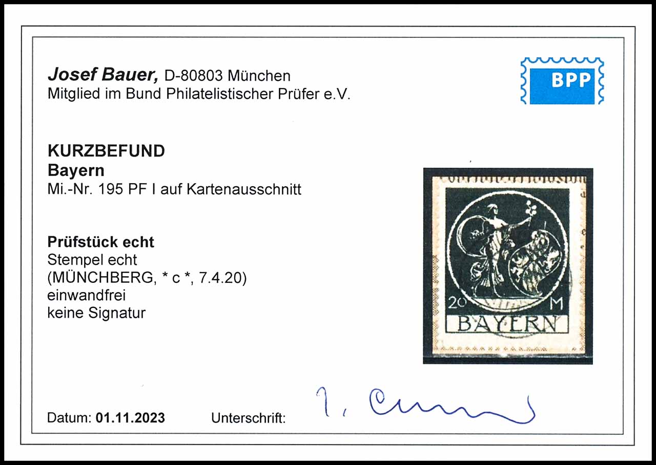 20 Mark auf kleinem Kartenausschnitt, tadellos gestempelt MÜNCHBERG 7.4.20, mit Plattenfehler I, Kurzbefund Josef Bauer BPP (2023)