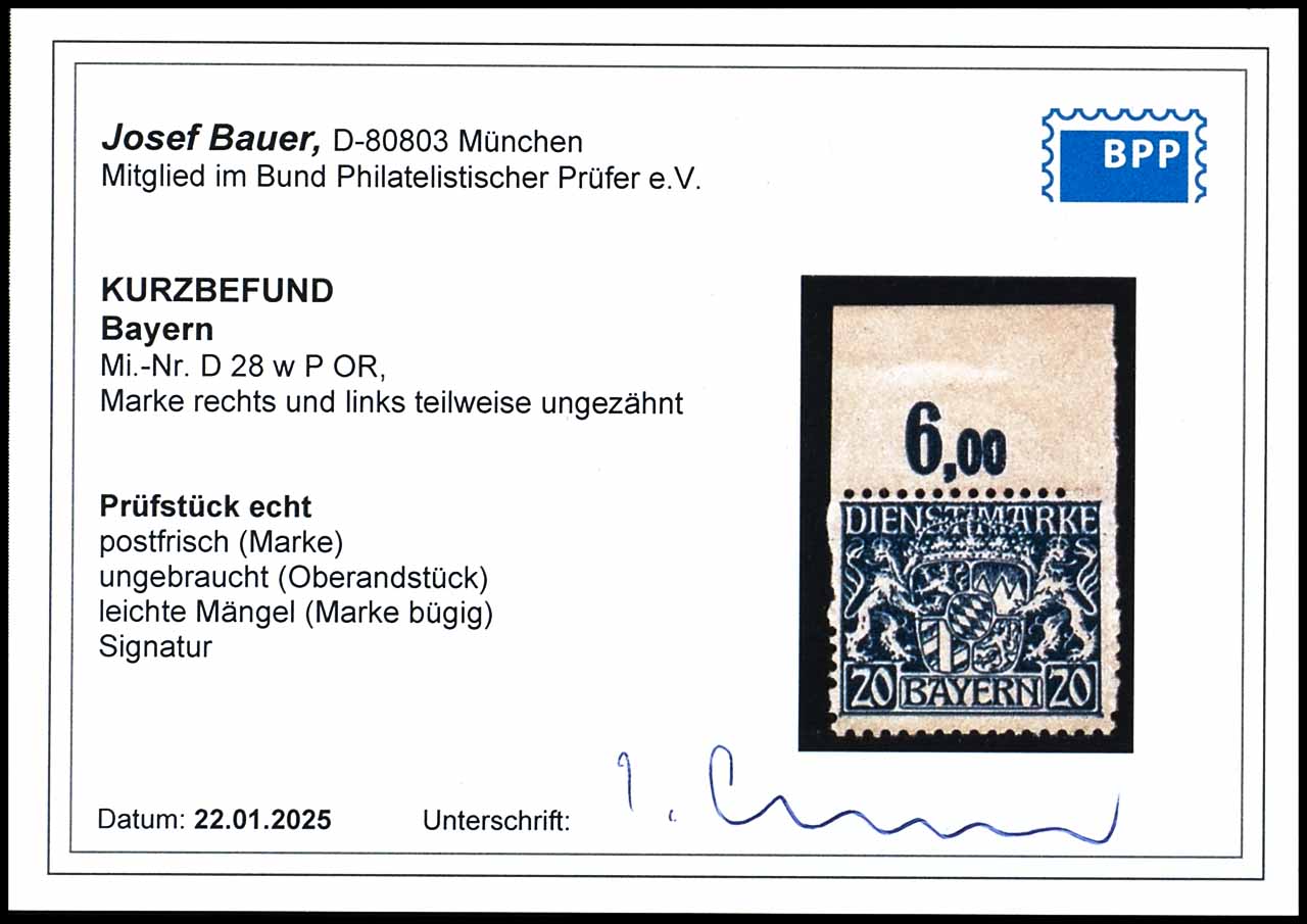 20 Pf. auf w-Papier, Oberrandstück, rechts und links teilweise ungezähnt, ungebraucht mit Falzrest, kleine Büge, geprüft Bauer BPP, Kurzbefund Bauer BPP