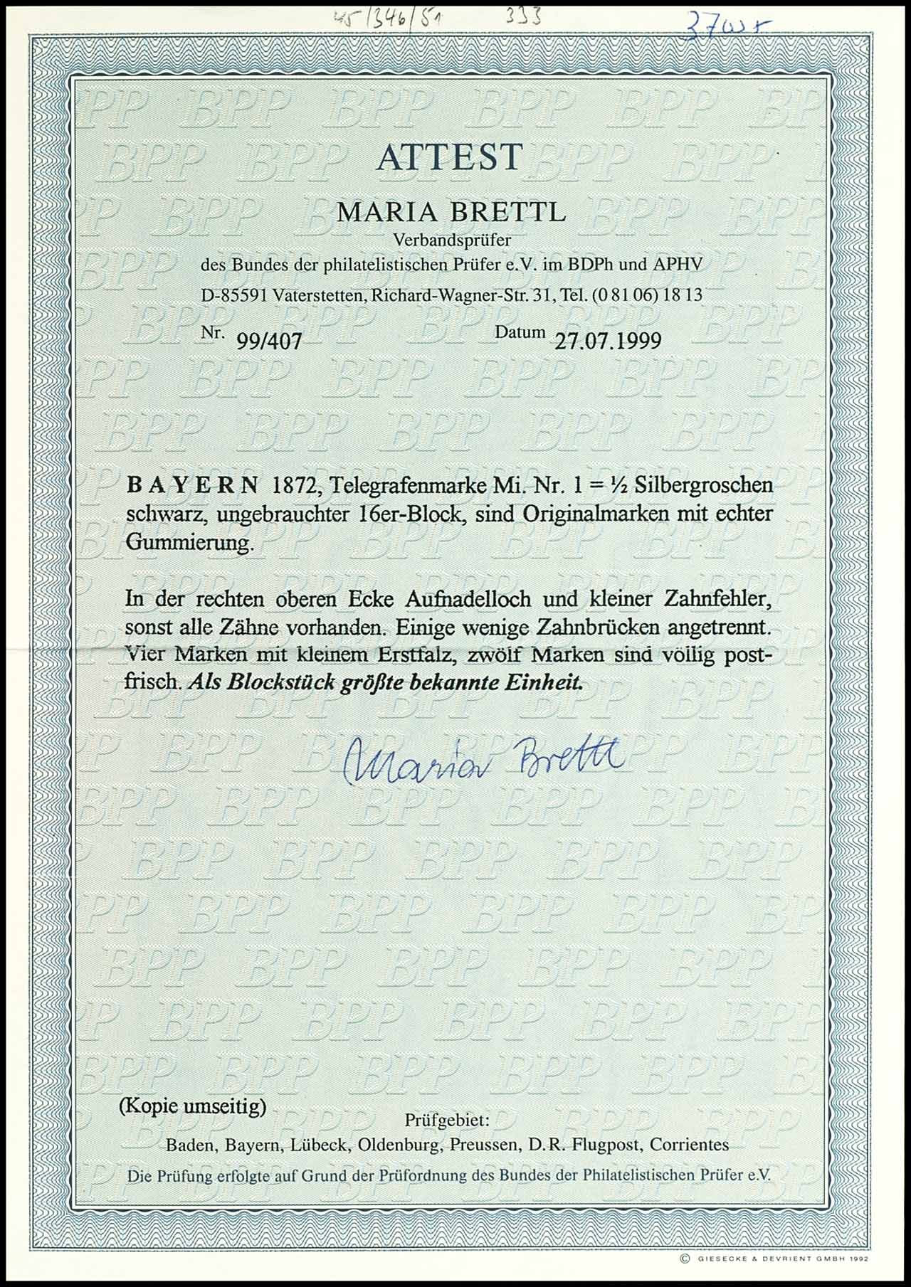 1/2 Silbergroschen schwarz, ungebrauchter Sechzehnerblock, in der rechten oberen Ecke Aufnadelloch und kleiner Zahnfehler sonst tadellos gezähnt, einige wenige Zahnbrücken angetrennt, vier Marken mit kleinem Erstfalz - zwölf Marken sind postfrisch und die Einheit ist gänzlich unsigniert, als Blockstück größte bekannte Einheit dieser Wertstufe, Fotoattest Maria Brettl BPP.