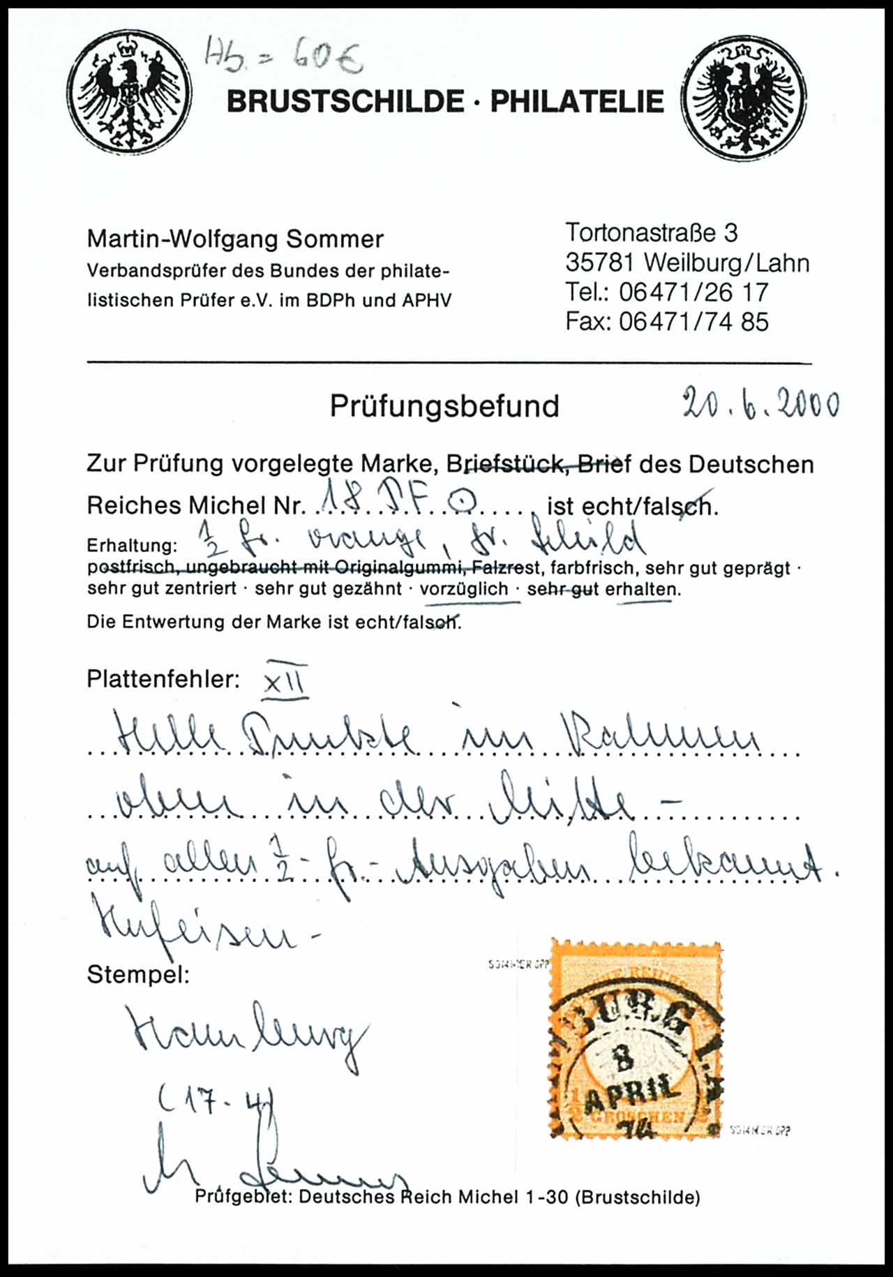 1/2 Groschen Großer Schild, entwertet mit Hufeisenstempel Spalink 17-4 "HAMBURG P.A. 8 APRIL 74...", Plattenfehler XII: helle Punkte im Rahmen oben in der Mitte", unsigniert, Fotobefund Martin-Wolfgang Sommer BPP (2000) "sehr gut gezähnt, vorzüglich erhalten", Mi. 200,-