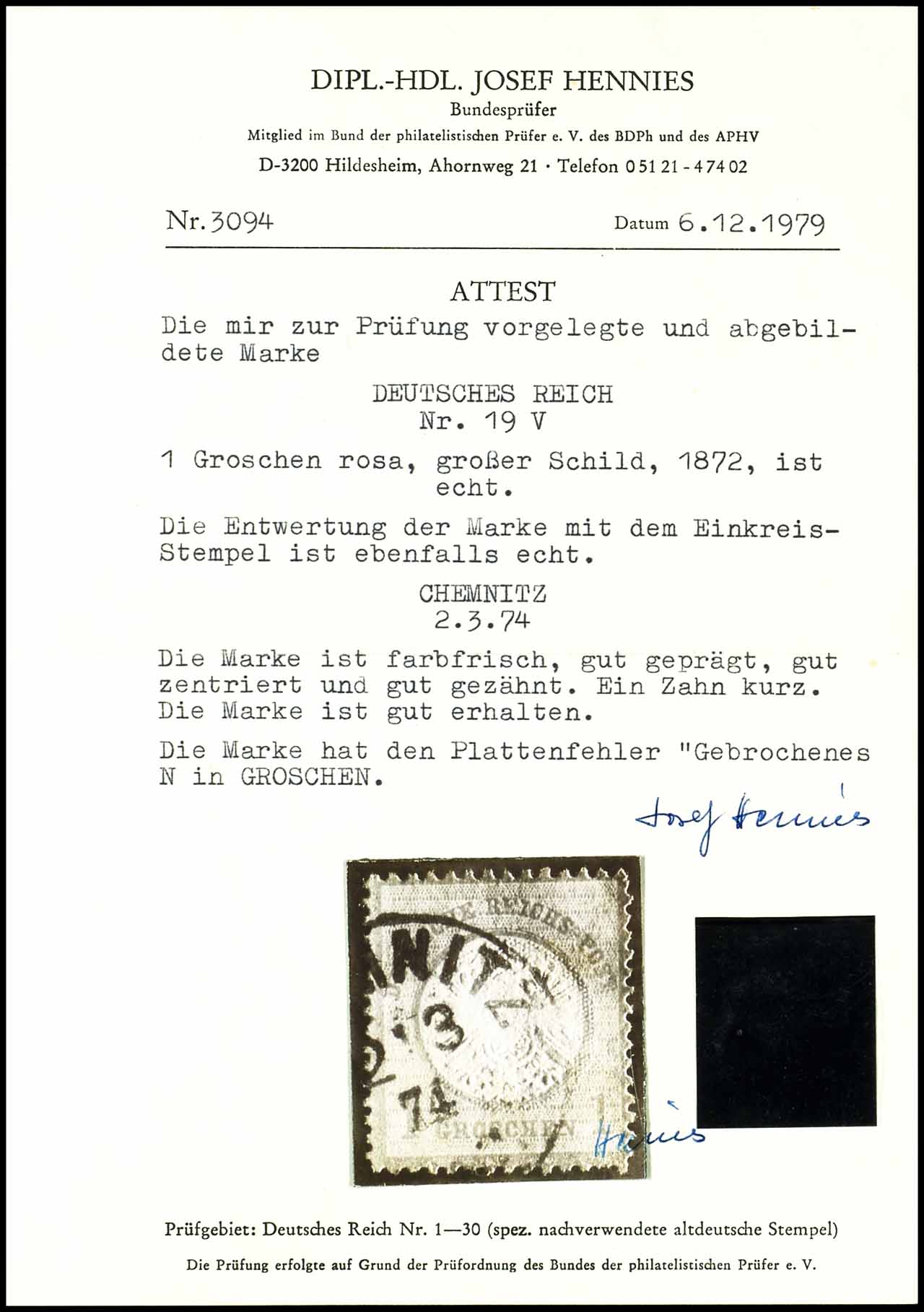 1 Groschen Großer Schild, entwertet mit Einkreisstempel "CHEMNITZ 2/3 74...", gut erhalten, unsigniert, Plattenfehler V: "gebrochenes N in GROSCHEN, Feld 143" , Fotoattest Hennies (1979), Mi. 100,-