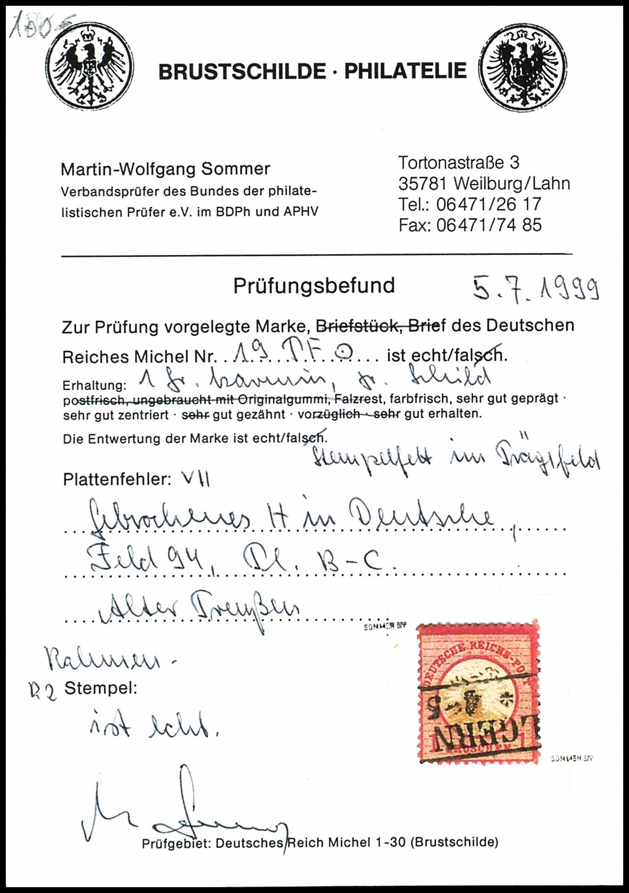 1 Groschen Großer Schild, entwertet mit R2-Stempel "....LGERN....", sehr gut erhalten, unsigniert, Plattenfehler VII: "gebrochenes H in Deutsche, Feld 94 Platte B-C" , Fotobefund Martin-Wolfgang Sommer BPP (1999), Mi. 100,-