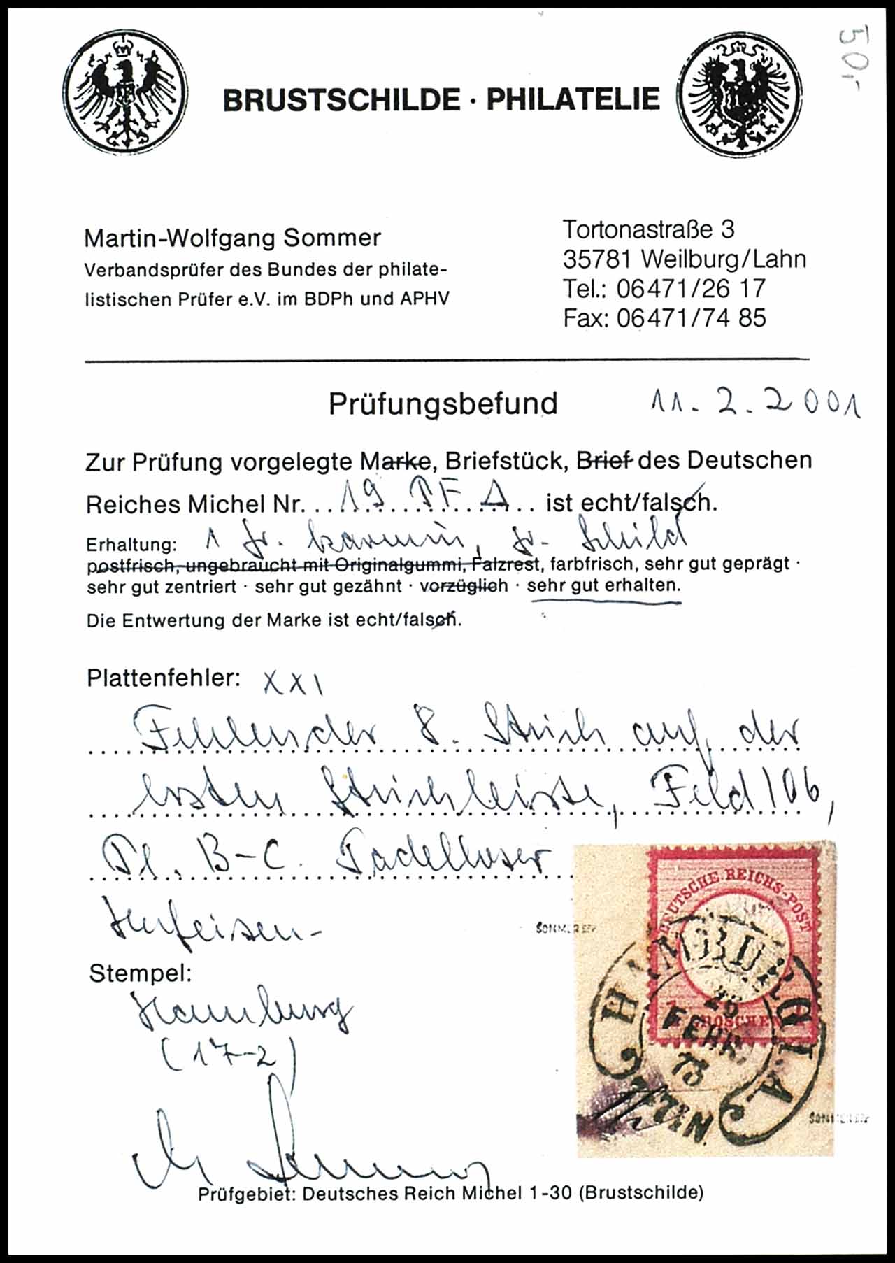 1 Groschen Großer Schild auf kleinem Briefstück, entwertet mit Hufeisenstempel "HAMBURG I. A. 26 FEBR. 73 7-71/2N." Spalink 17-2, sehr gut erhalten, unsigniert, Plattenfehler XXI: "achter Strich der ersten Strichleiste fehlt, Feld 106" , Fotobefund Martin-Wolfgang Sommer BPP (2001), Mi. 30,-+
