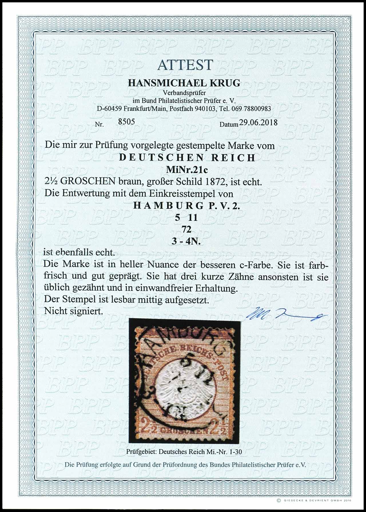 2 1/2 Groschen Großer Schild, c-Farbe in heller Nuance, entwertet mit Einkreisstempel von "HAMBURG P.V.2./5 11 72 3-4N.", sehr gut erhalten, unsigniert, Fotoattest Hansmichael Krug BPP (2016), "rechts drei Zähne verkürzt, ansonsten in einwandfreier Erhaltung", Mi. 2.000,-