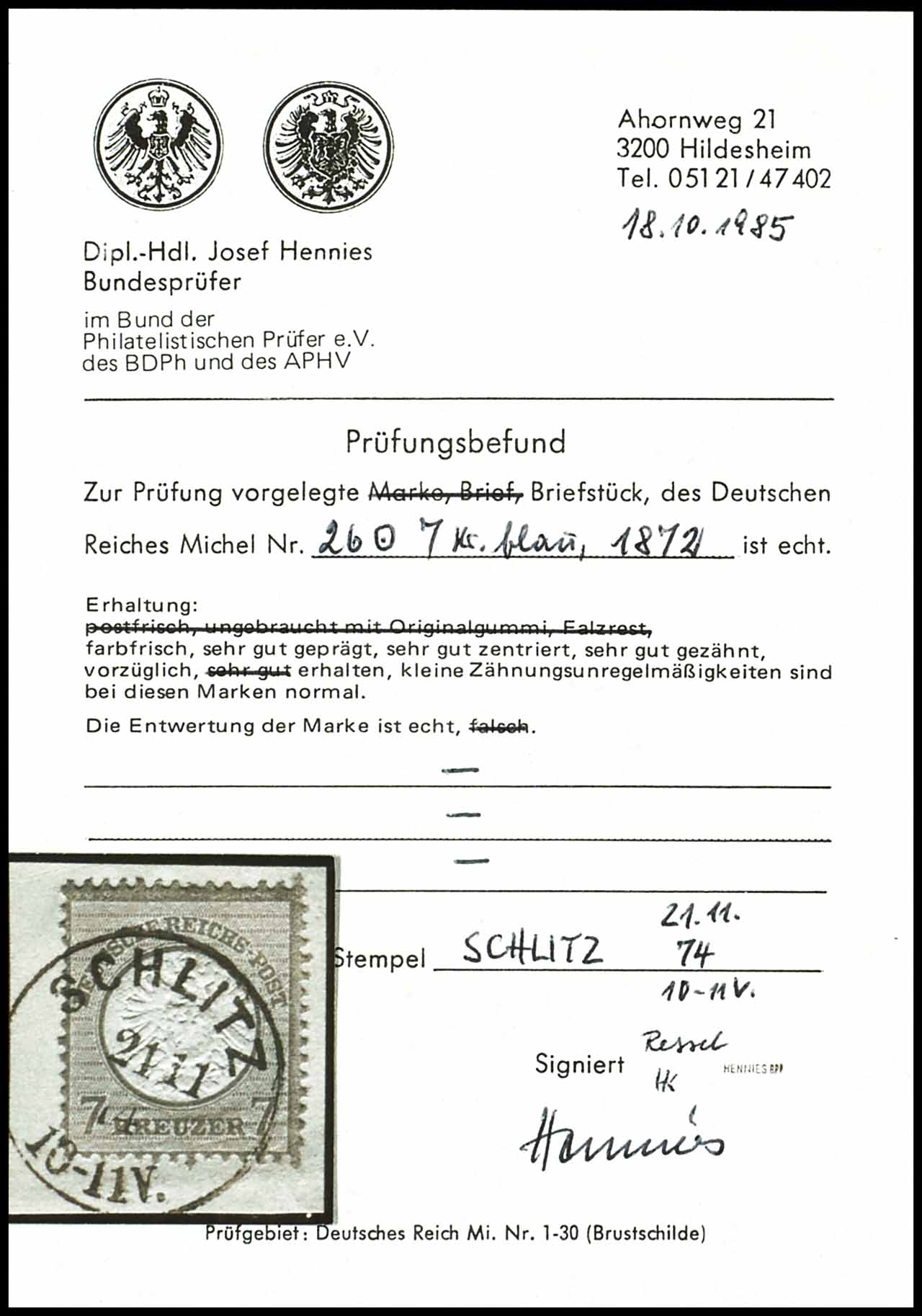 7 Kreuzer Großer Schild, entwertet mit Einkreisstempel von "SCHLITZ 21 11 74 10-11V.", tadellos, geprüft Hennies BPP und Ressel, Fotobefund Hennies BPP (1985) "vorzüglich erhalten", Mi. 90,-
