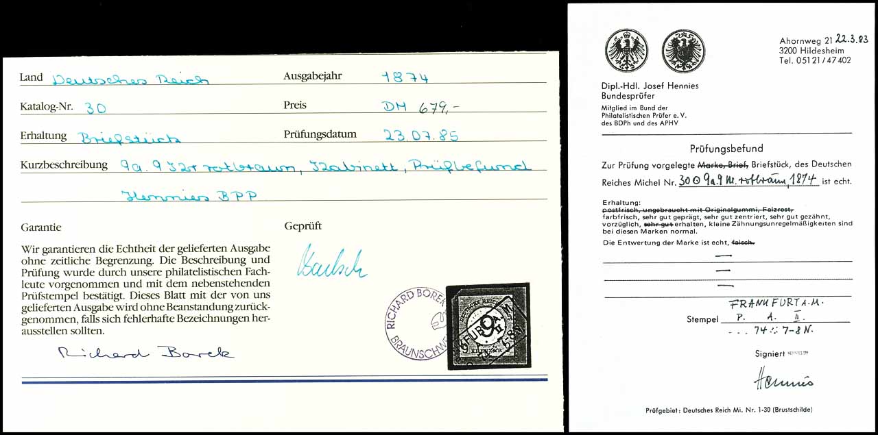 9 Kreuzer Großer Schild mit Buchdruck-Aufdruck "9" in Markenfarbe, rotbraun, farbfrisch, sehr gut geprägt, sehr gut zentriert, auf kleinem Briefstück, entwertet mit L3-Stempel von "FRANKFURT a.M. P.A.II...74...7-8N", Prüfungsbefund Hennies BPP (1983) "vorzüglich erhalten" und Garantiekarte des Händlers Richard Borek (1985), Mi. 650,-