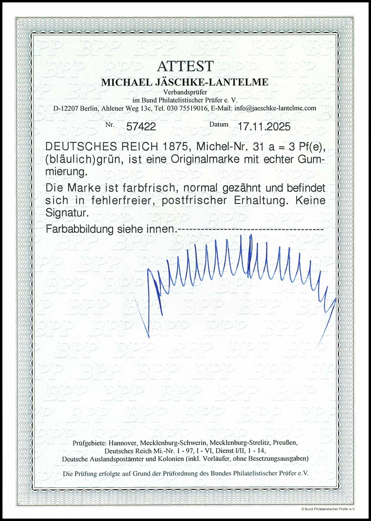 3 Pfennige bläulichgrün, farbfrisches und gut gezähntes Exemplar, postfrisch, tadellose Erhaltung, unsigniert, Fotoattest Jäschke-Lantelme BPP (2025) "in fehlerfreier Erhaltung", Mi. 600.-