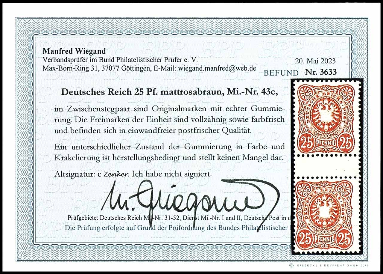 25 Pfennig mattrosabraun (orangebraun), senkrechtes Zwischenstegpaar, postfrisch, tadellose Erhaltung, Fotobefund Manfred Wiegand BPP (2023) "Farbfrisch in einwandfreier postfrischer Qualität", Mi. 300.-