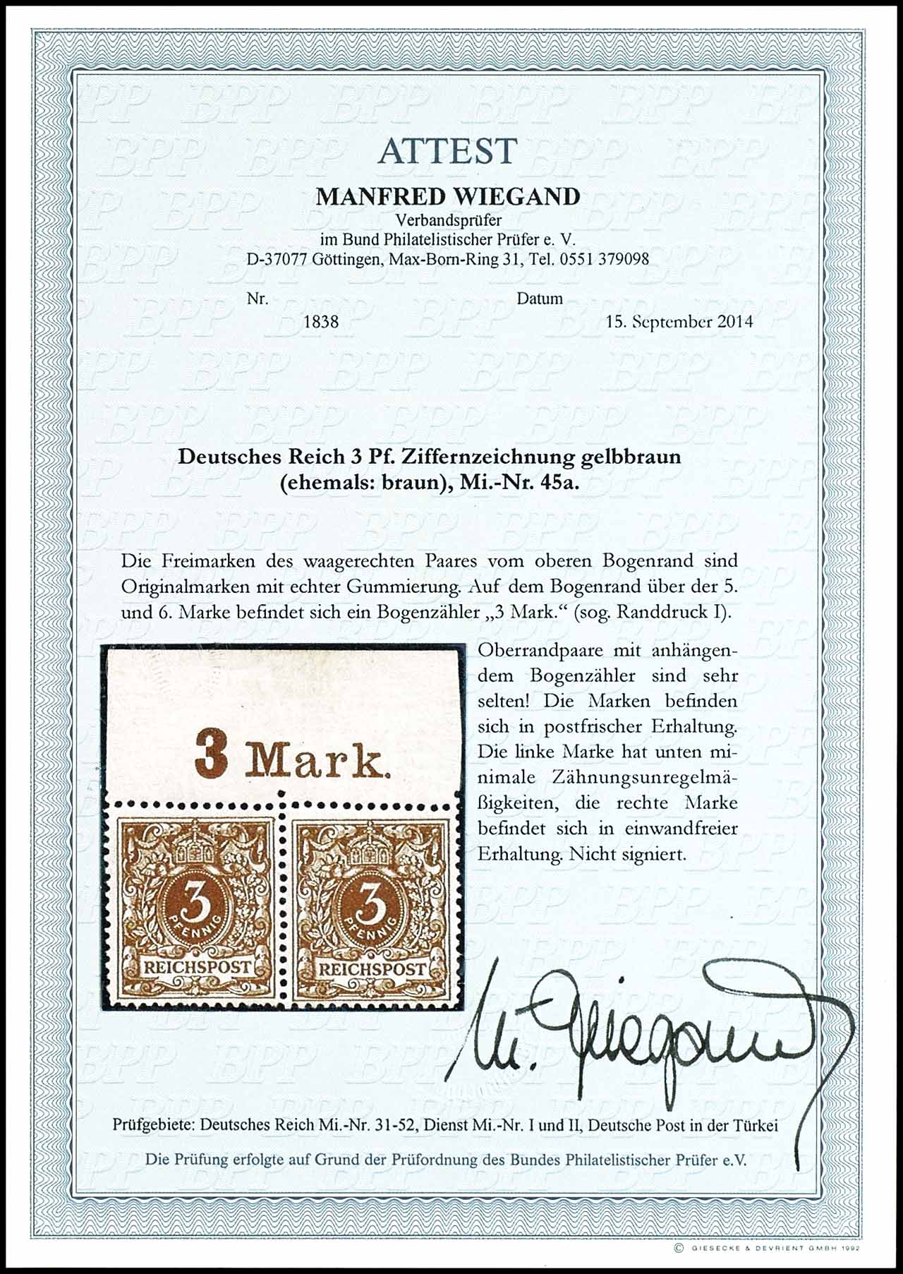 3 Pfennig Krone/Adler gelbbraun, waagerechtes Paar vom oberen Bogenrand (dort ungebraucht) mit Bogenzähler "3 Mark" sog. Randdruck I, postfrisch, die linke Marke Zähnung minimal unregelmäßig, darüber hinaus tadellose Erhaltung, sehr selten, Fotoattest Manfred Wiegand BPP "Oberrandpaare mit anhängendem Bogenzähler sind sehr selten!"