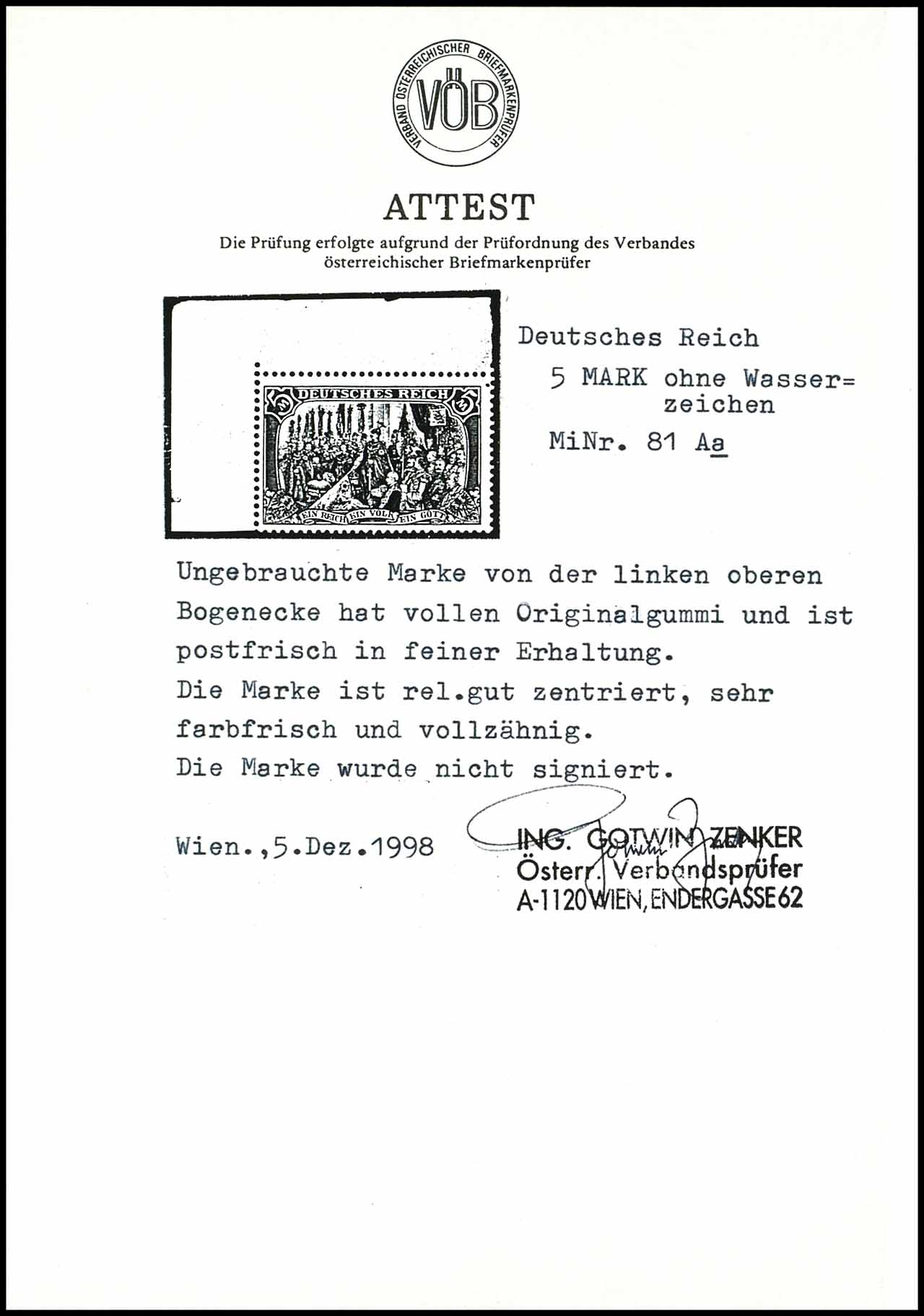 5 Mark grünschwarz/dunkelkarmin, postfrisches Eckrandstück, tadellose Erhaltung, Attest Zenker VÖB, Mi. 900,-