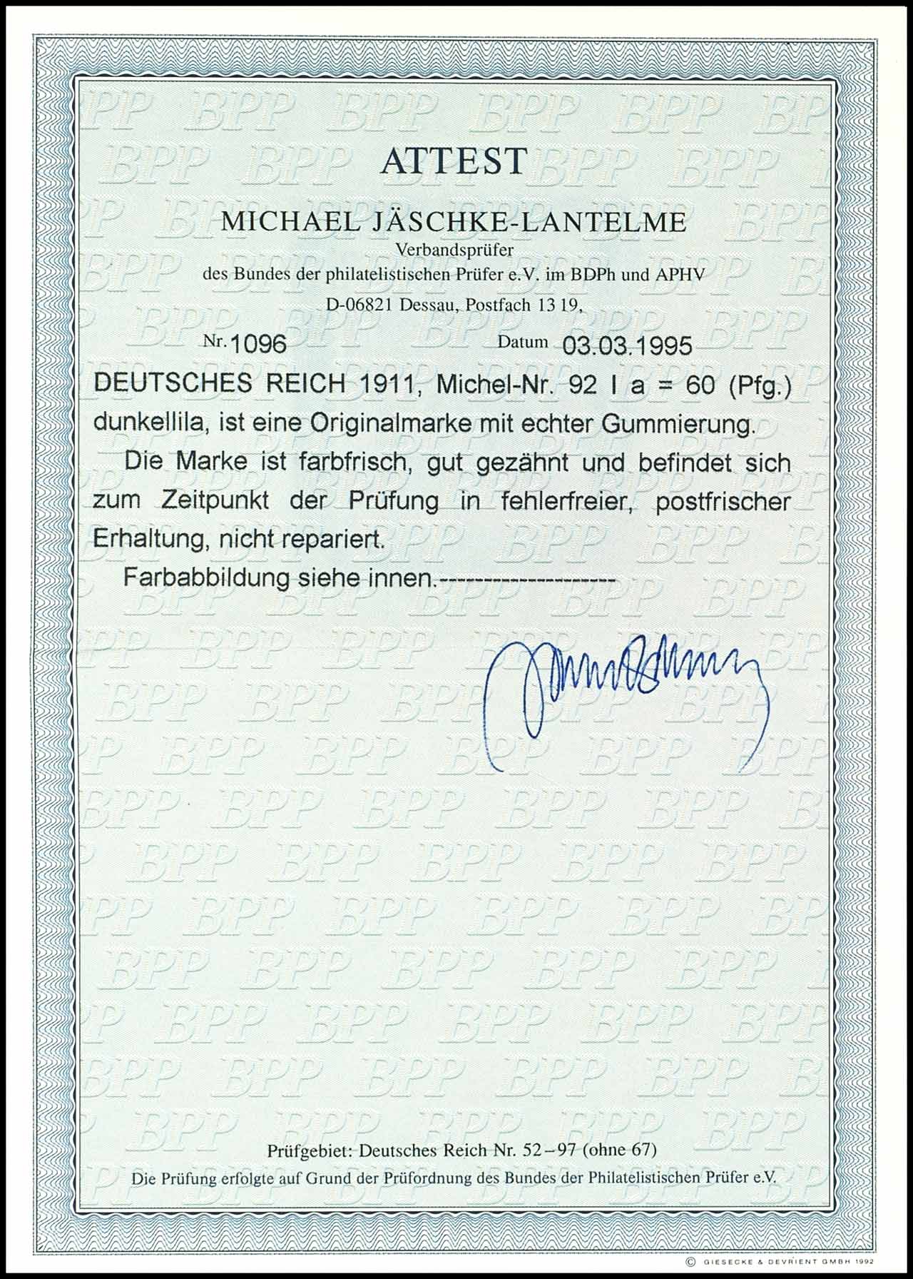 60 Pfennig dunkelgraulila, postfrisch, tadellose Erhaltung, Fotoattest Jäschke-L. BPP, Mi.800,-