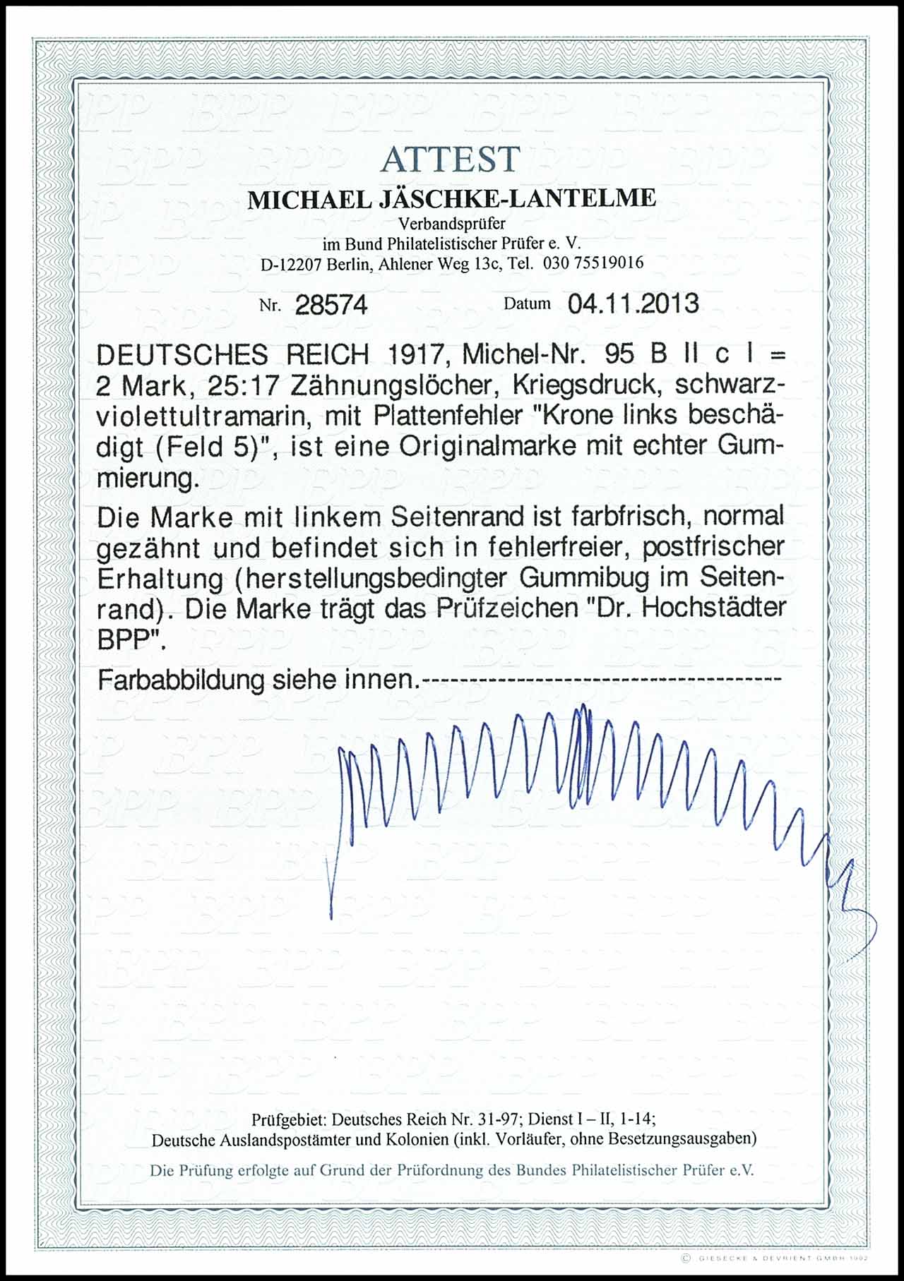 2 Mark schwarzviolettultramarin, Kriegsdruck, 25 : 17 Zähnungslöcher, Plattenfehler I "Krone links beschädigt (Feld 5)", vom linken Bogenrand, postfrisch, tadellose Erhaltung, geprüft Dr. Hochstädter BPP, Fotoattest Michael Jäschke-Lantelme BPP "in fehlerfreier, postfrischer Erhaltung."