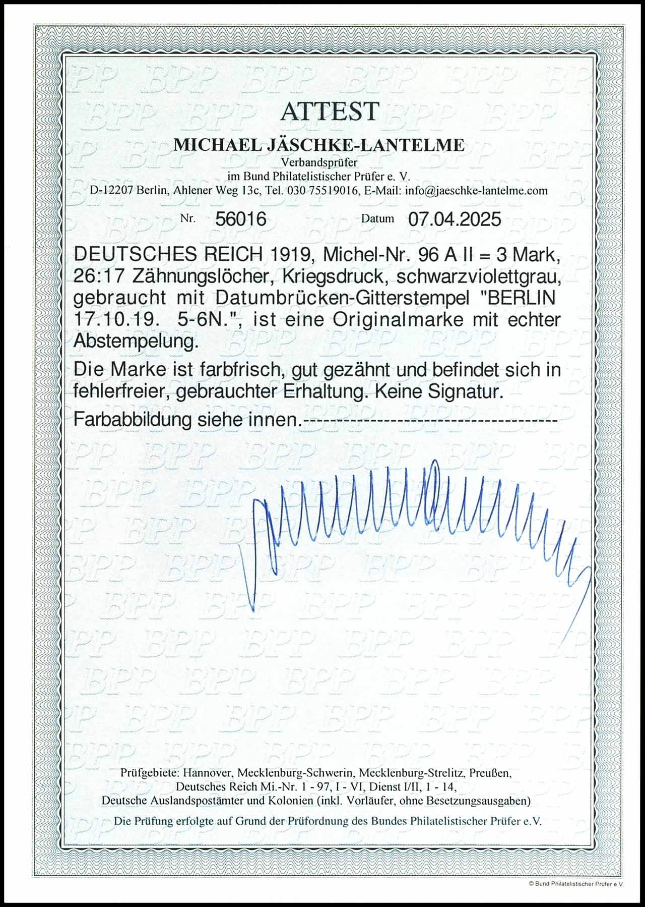 3 Mark schwarzviolettgrau, 26 : 17 Zähnungslöcher, Kriegsdruck, entwertet mit Datumbrücken-Gitterstempel BERLIN 17.10.19, tadellose Erhaltung, unsigniert, Fotoattest Michael Jäschke-Lantelme BPP (2025) "in fehlerfreier, gebrauchter Erhaltung."