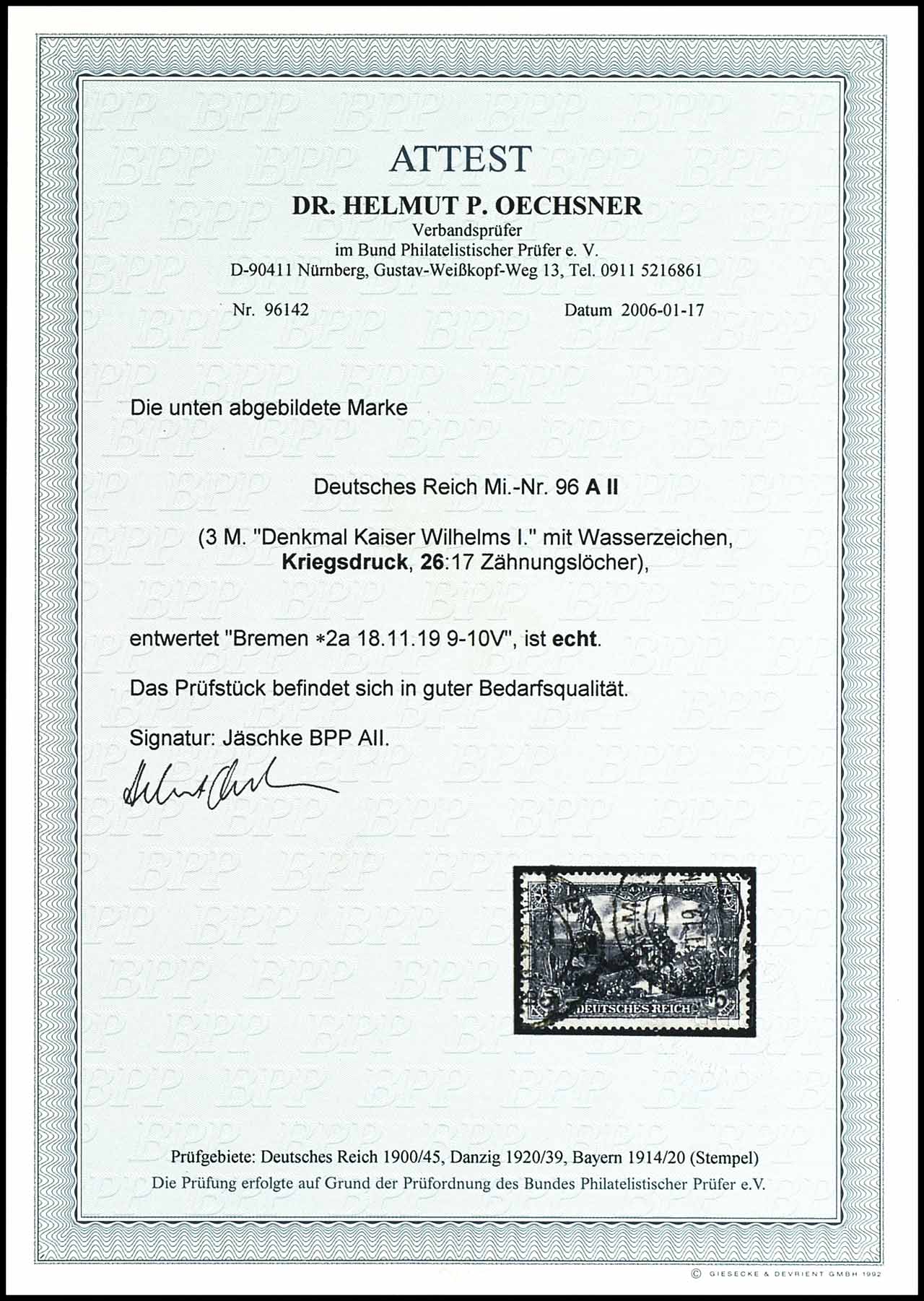 3 Mark schwarzviolettgrau, Kriegsdruck, 26 : 17 Zähnungslöcher, gestempelt BREMEN 18.11.19, geprüft Jäschke BPP, Fotoattest Dr. Helmut P. Oechsner BPP "In guter Bedarfsqualität."