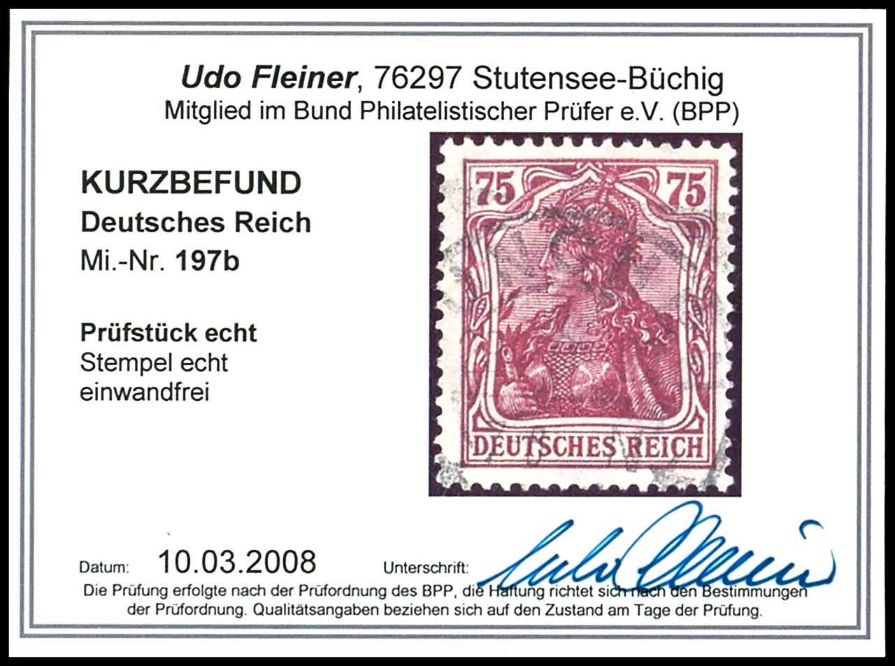 75 Pfennig Germania 1922, Wasserzeichen 2 Waffeln, b-Farbe lilakarmin, gestempelt, tadellose Erhaltung, unsigniert, Fotobefund Udo Fleiner BPP (2028) "echt und einwandfrei", Mi. 200.-