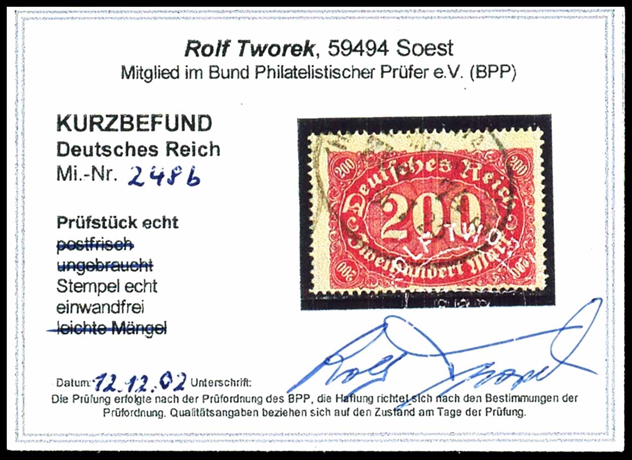 200 Mark Ziffernserie sogenannter "Queroffset", 1923, b-Farbe lebhaftrotkarmin, gestempelt, tadellos, Fotobefund Rolf Tworek BPP (2002) "echt und einwandfrei", Mi. 100,-