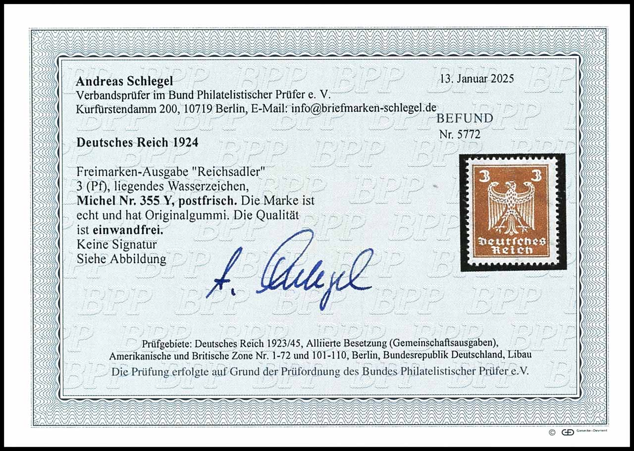 3 Pfennig Reichsadler, liegendes Wasserzeichen, postfrisch, tadellose Erhaltung, unsigniert, Fotobefund Andreas Schlegel BPP (2024) "Die Qualität ist einwandfrei.", Mi. 400.-