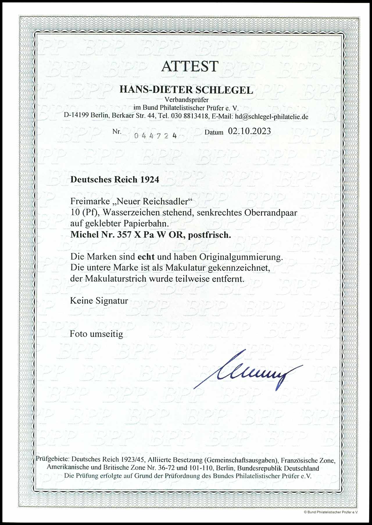 10 Pf Reichsadler, einwandfrei, postfrisch, senkrechtes Oberrandpaar auf geklebter Papierbahn, Fotoattest Schlegel BPP, Makulaturstrich wurde teilweise entfernt, Mi 550.-
