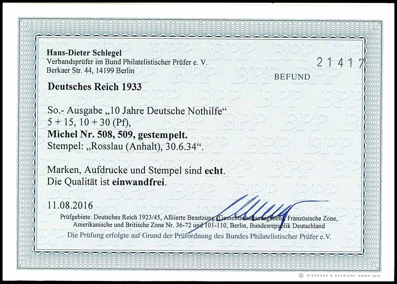 5+15 und 10+30 Pfennig Deutsche Nothilfe 1933, Blockeinzelmarken, 2 Werte tadellos, gestempelt "ROSSLAU (ANHALT) c 30.6.34 17-18 Fotobefund Hans-Dieter Schlegel BPP (2016) "Marken, Aufdrucke und Stempel sind echt, die Qualität ist einwandfrei.", Mi. 1.000.-