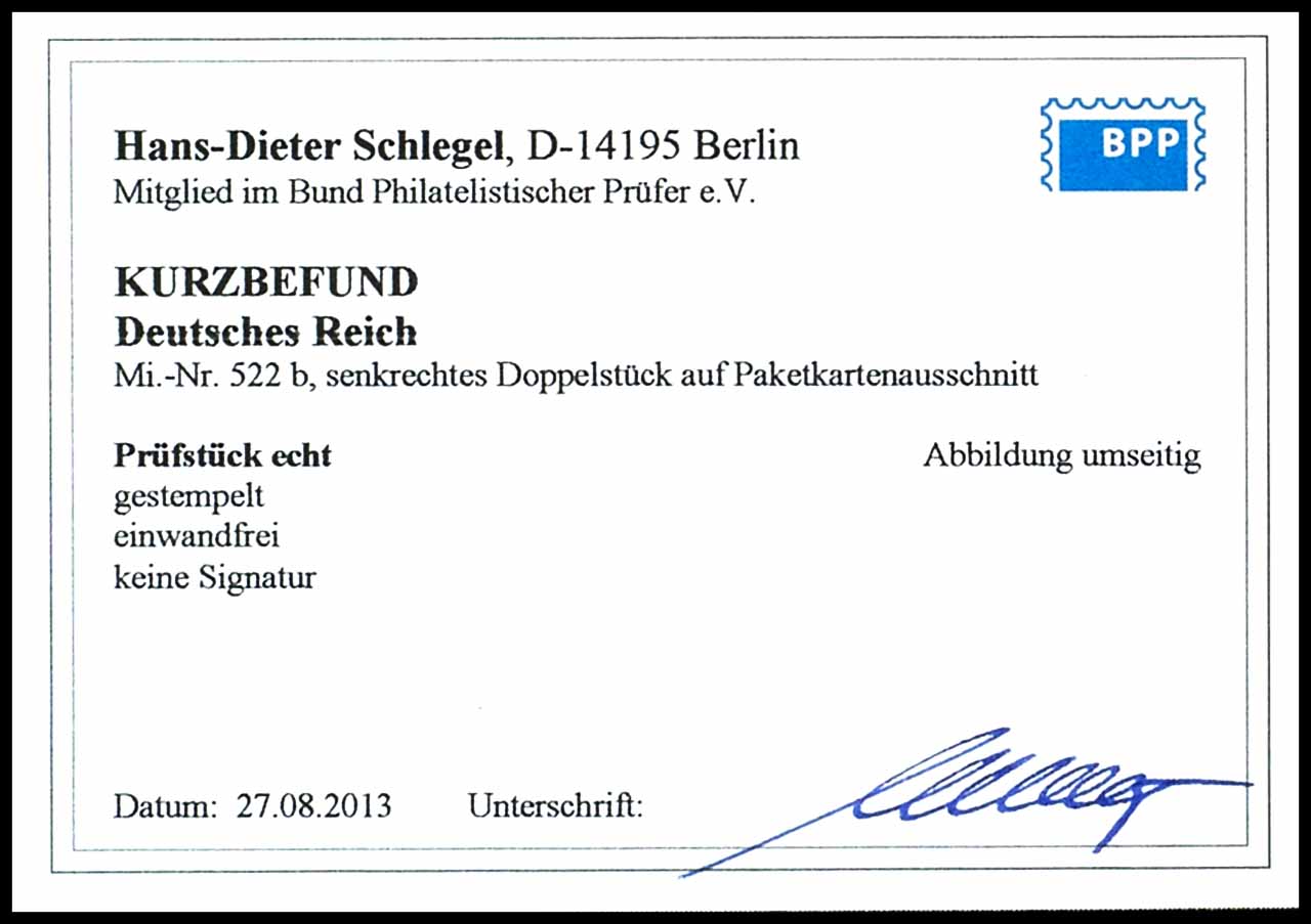 25 Pfennig Hindenburg, Wasserzeichen 4, b-Farbe lebhaftultramarin, senkrechtes Paar auf kleinem Paketkartenausschnitt, entwertet "BERLIN....-8.3.40 17-18", tadellos erhalten, unsigniert, Fotobefund Hans-Dieter Schlegel BPP (2013), Mi. 120,-++