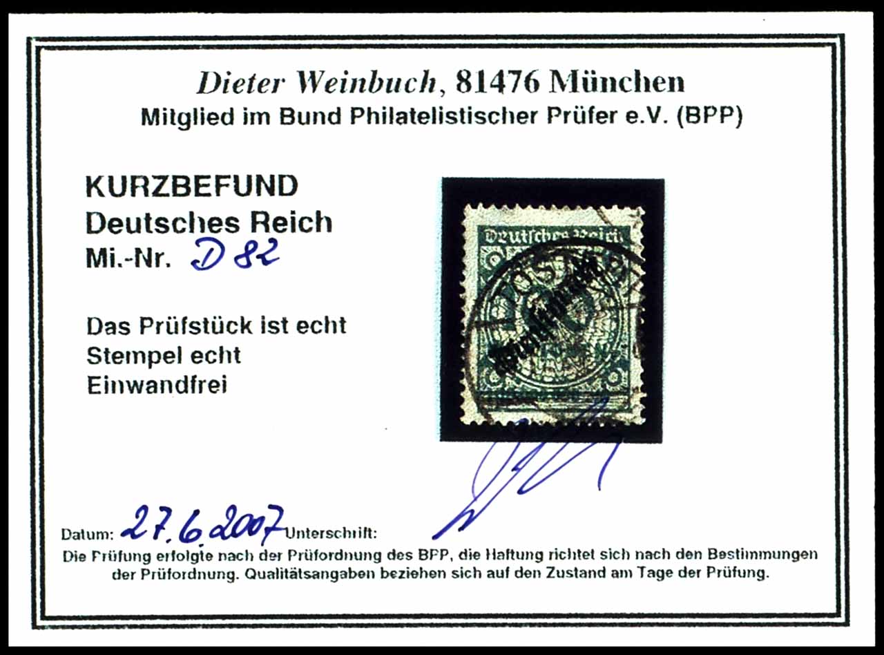 100 Millionen Mark, dunkelgrünlichgrau, mit schwarzem, schlangenförmigem Buchdruckaufdruck "Dienstmarke", gestempelt TOSTEDT, tadellos erhalten, Fotobefund Dieter Weinbuch BPP (2007) "echt und einwandfrei", Mi. 200,-