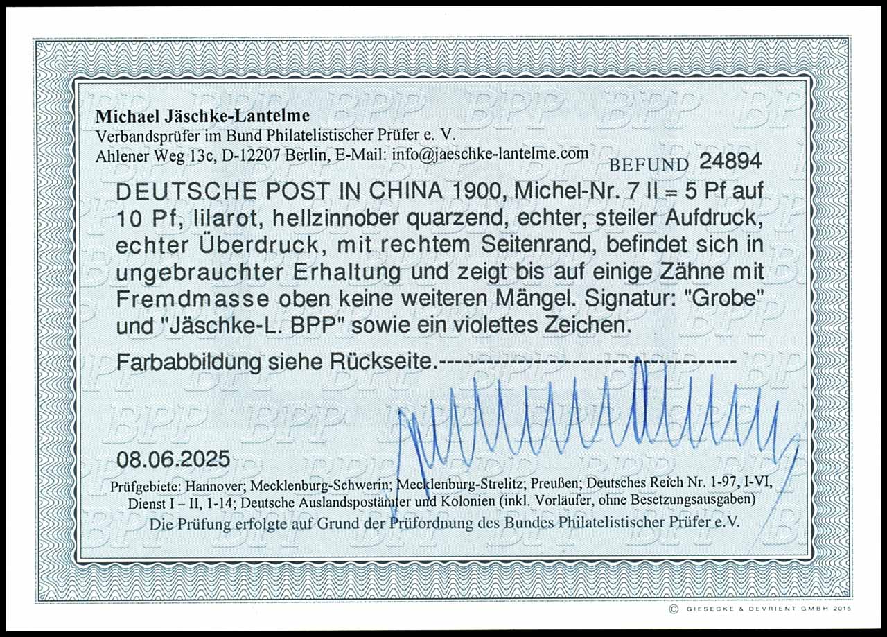 5 Pf. auf 10 Pf. Steilaufdruck, lilarot, hellzinnober quarzend, rechtes Seitenrandstück, ungebraucht mit Falzrest, oben Zähnung ergänzt, signiert, Fotobefund Jäschke-Lantelme BPP (2025), Mi. 1.000.-