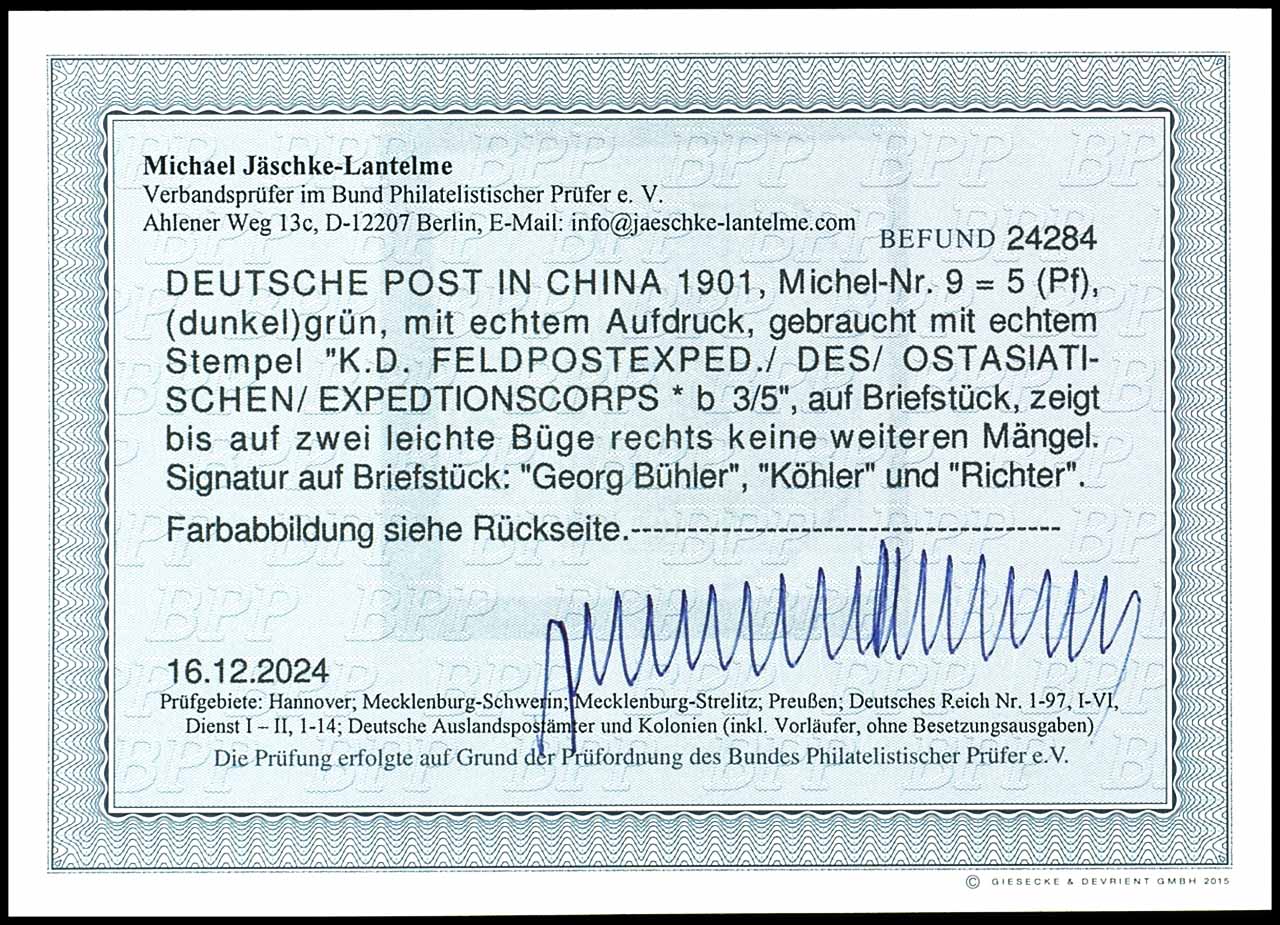 5 Pf. Handstempel auf Briefstück mit Stempel "K.D. FELDPOSTEXPED./DES/ OSTASIATISCHEN/EXPEDITIONSCORPS * b 3/5", Fotobefund Jäschke-Lantelme BPP (2024): "bis auf zwei leichte Büge rechts keine weiteren Mängel" Mi. 500.-