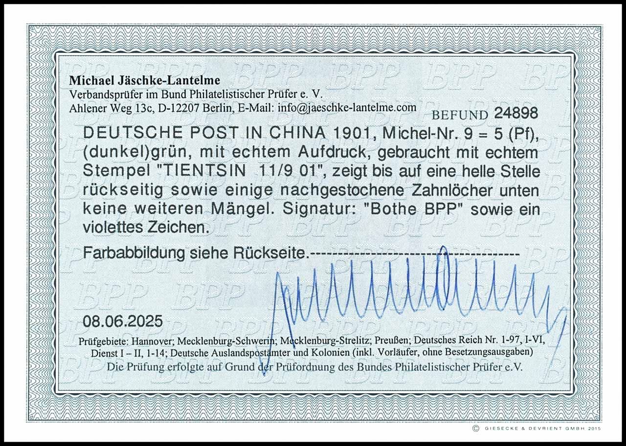 5 Pfennig Handstempel, entwertet "TIENTSIN 11/9 01", einige Zähne nachgestochen und rückseitig helle Stelle, signiert, Fotobefund Jäschke-Lantelme BPP, Mi. 300,--