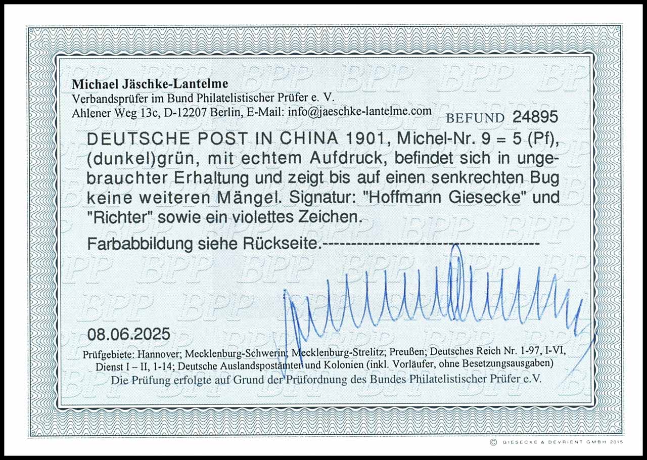 5 Pfennig Handstempel, ungebraucht mit Originalgummi und Falzrest, minimaler senkrechter Bug, geprüft Hoffmann-Giesecke und Richter, Fotobefund Jäschke-Lantelme BPP (2025), Mi. 500.-