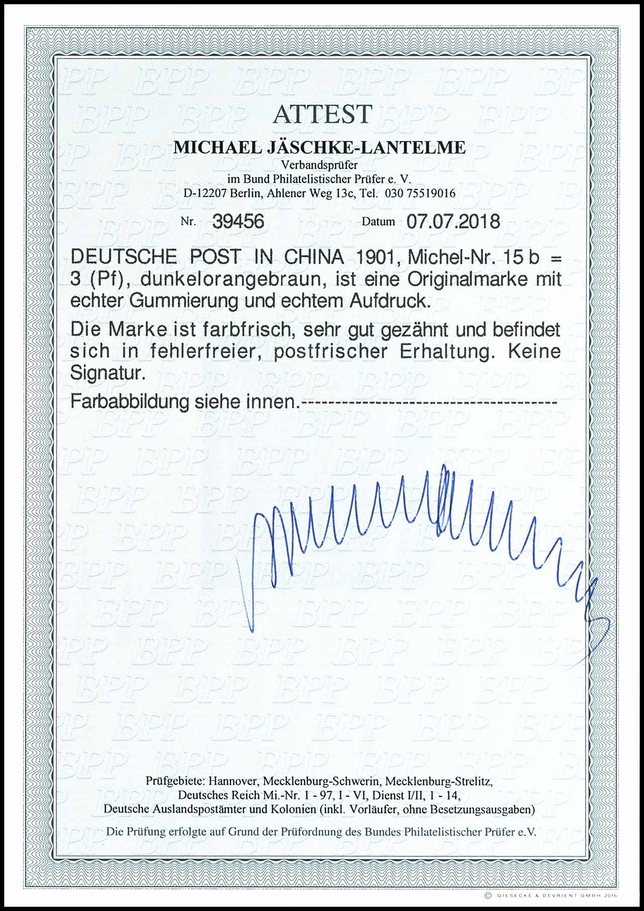 3 Pfennig Germania, dunkelorangebraun mit schwarzem Bdr.-Aufdruck "China", postfrisch, tadellose Erhaltung, unsigniert, Fotoattest Michael Jäschke-Lantelme BPP "in fehlerfreier, postfrischer Erhaltung."