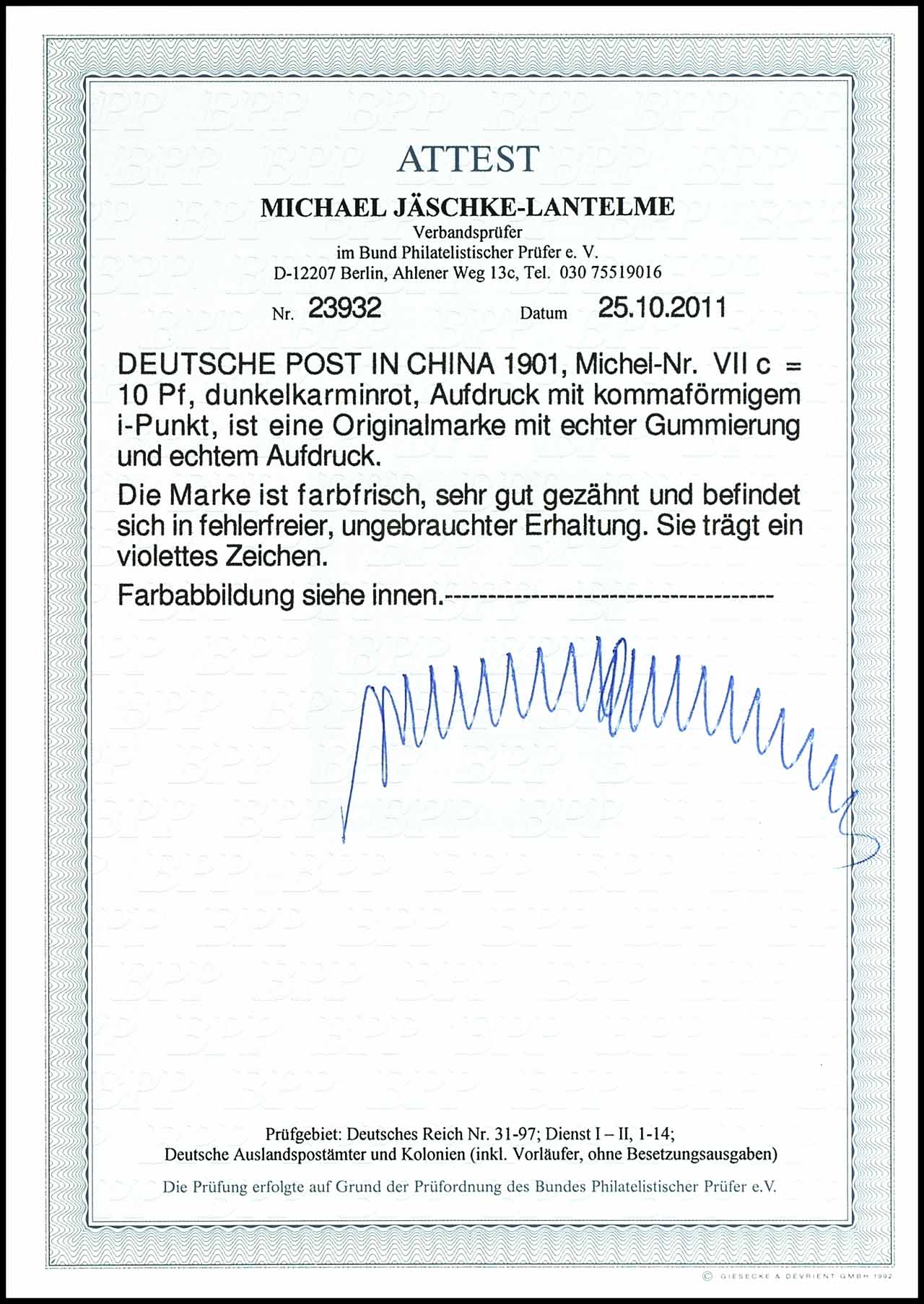 Nicht ausgegeben: 10 Pfennig Germania, dunkelkarminrot mit kommaförmigem i-Punkt im Aufdruck "China", ungebraucht mit Originalgummierung, tadellose Erhaltung, signiert, Fotoattest Michael Jäschke-Lantelme BPP "in fehlerfreier, ungebrauchter Erhaltung."