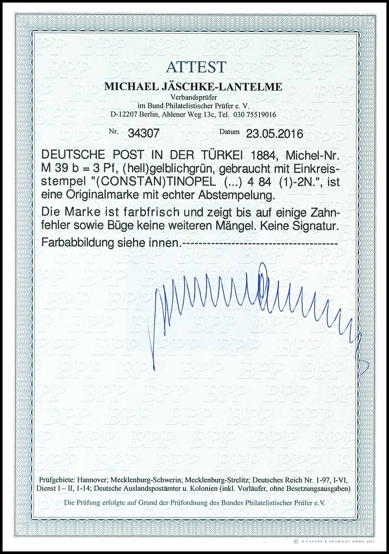 3Pfg., Mitläufer "Pfennig", gelblichgrün, gestempelt, farbfrisch, kleine Mängel, selten, nicht signiert, Fotoattest Jäschke-Lantelme BPP, Mi1600.-