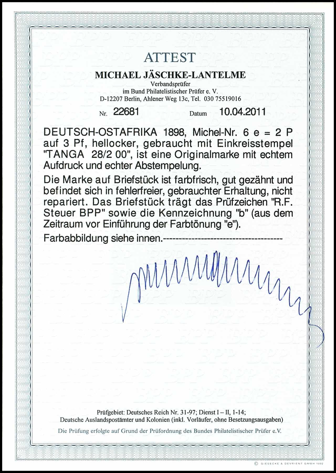 2 Pesa auf 3 Pfennig Krone/Adler, hellocker, Briefstück, tadellose Erhaltung, geprüft R.F. Steuer BPP, Fotoattest Jäschke-Lantelme BPP, Mi. 500.-