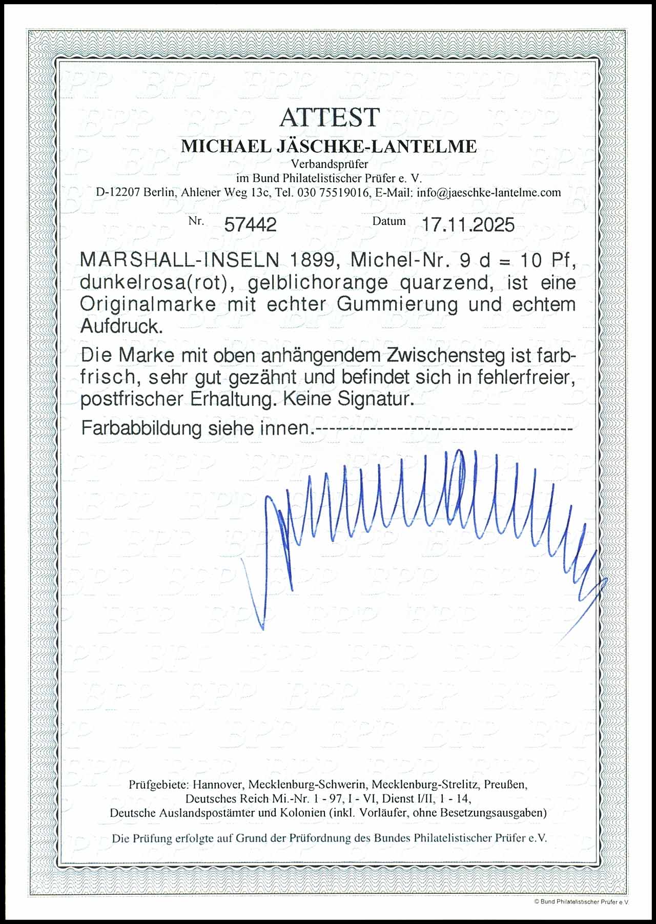10 Pfennig Krone/Adler dunkelrosarot (UV gelblichorange quarzend) mit schwarzem Aufdruck "Marshall-Inseln", postfrisch, mit oben anhängendem Zwischensteg, tadellose Erhaltung, unsigniert, Fotoattest Michael Jäschke-Lantelme BPP "Farbfrisch, sehr gut gezähnt.....in fehlerfreier, postfrischer Erhaltung.", Mi. 1.500.-