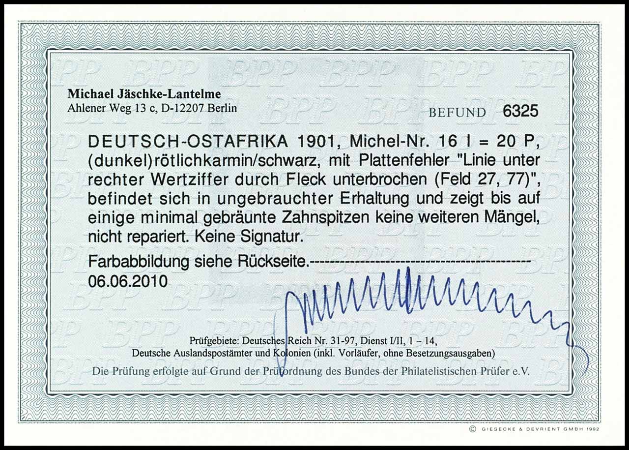 20 Pesa, rötlichkarmin/schwarz, Plattenfehler "Linie unter rechter Wertziffer durch Fleck unterbrochen", ungebraucht, Fotoattest Jäschke-L. BPP "zeigt bis auf einige minimal gebräunte Zahnspitzen keine weiteren Mängel", Mi. 600,-