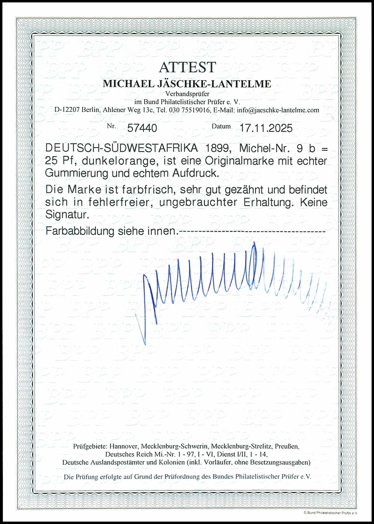 25 Pfennig Krone/Adler dunkelorange mit schwarzem Buchdruck-Aufdruck "Deutsch-Südwestafrika", ungebraucht, tadellose Erhaltung, unsigniert, Fotoattest Michael Jäschke-Lantelme (2025), Mi. 480.-