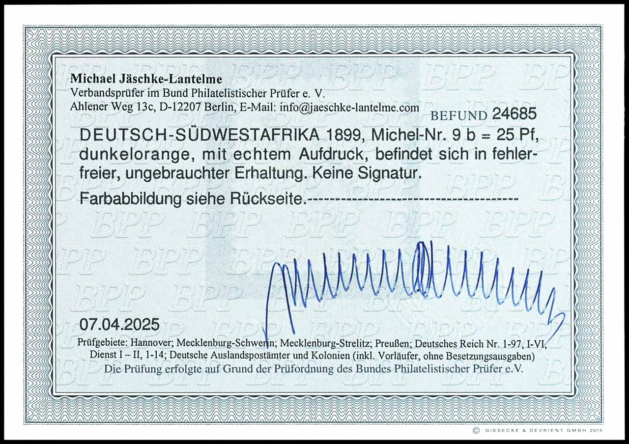 25 Pfennig Krone/Adler, dunkelorange mit Aufdruck "Deutsch-Südwestafrika", ungebraucht mit Originalgummierung, tadellose Erhaltung, unsigniert, Fotobefund Michael Jäschke-Lantelme BPP "in fehlerfreier, ungebrauchter Erhaltung."