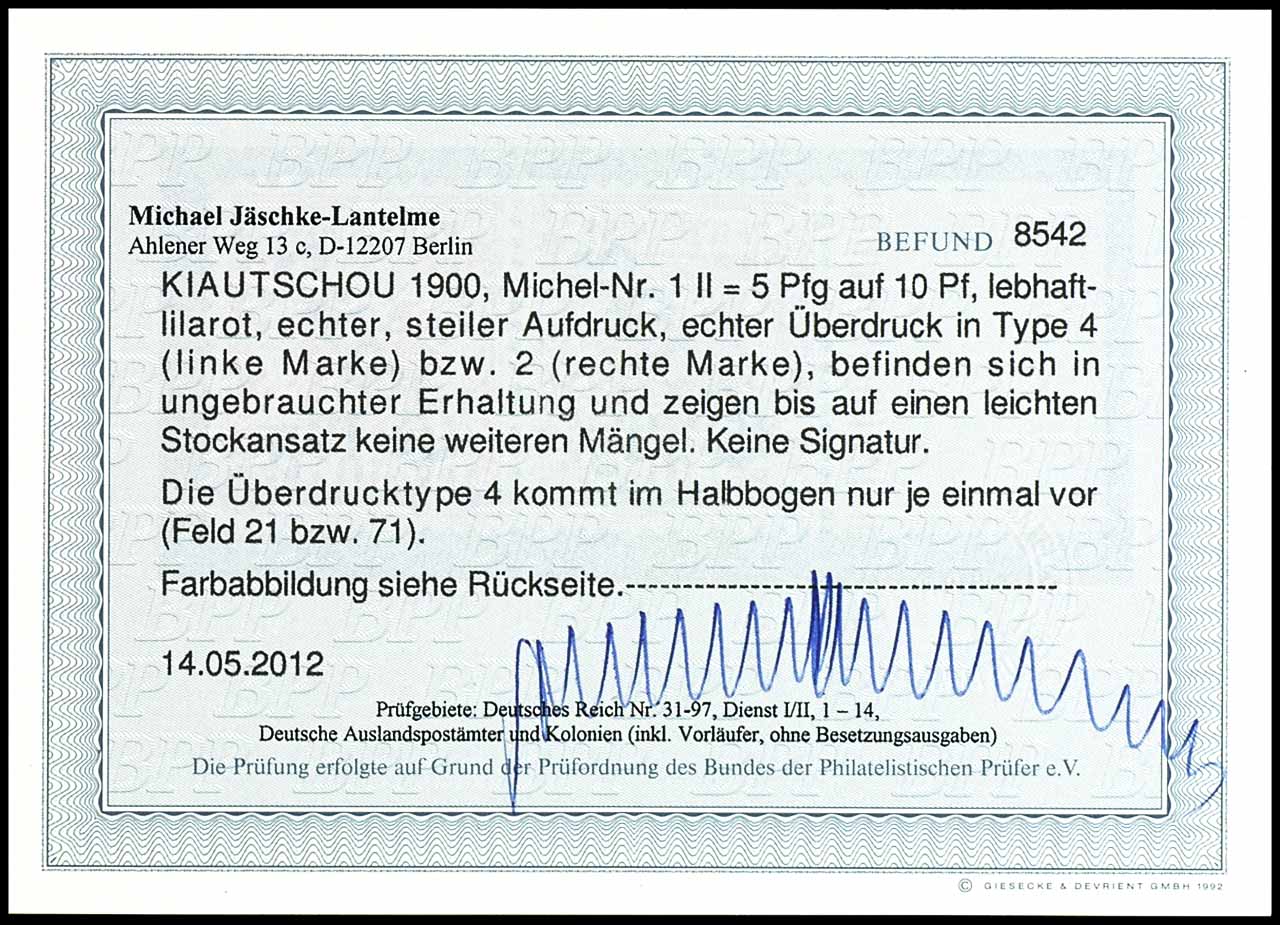 5 Pfg auf 10 Pfennig Krone/Adler mit steilem Bdr.-Aufdruck "China", waagerechtes Paar vom linken Bogenrand mit den Überdrucken in Type 2 und 4 - Überdruck in Type 4 - nur einmal im Halbbogen vorkommend (Feld 21 oder 71), ungebraucht mit Originalgummierung, abgesehen von einem leichten Stockansatz keine weiteren Mängel, unsigniert, Fotobefund Michael Jäschke-Lantelme BPP
