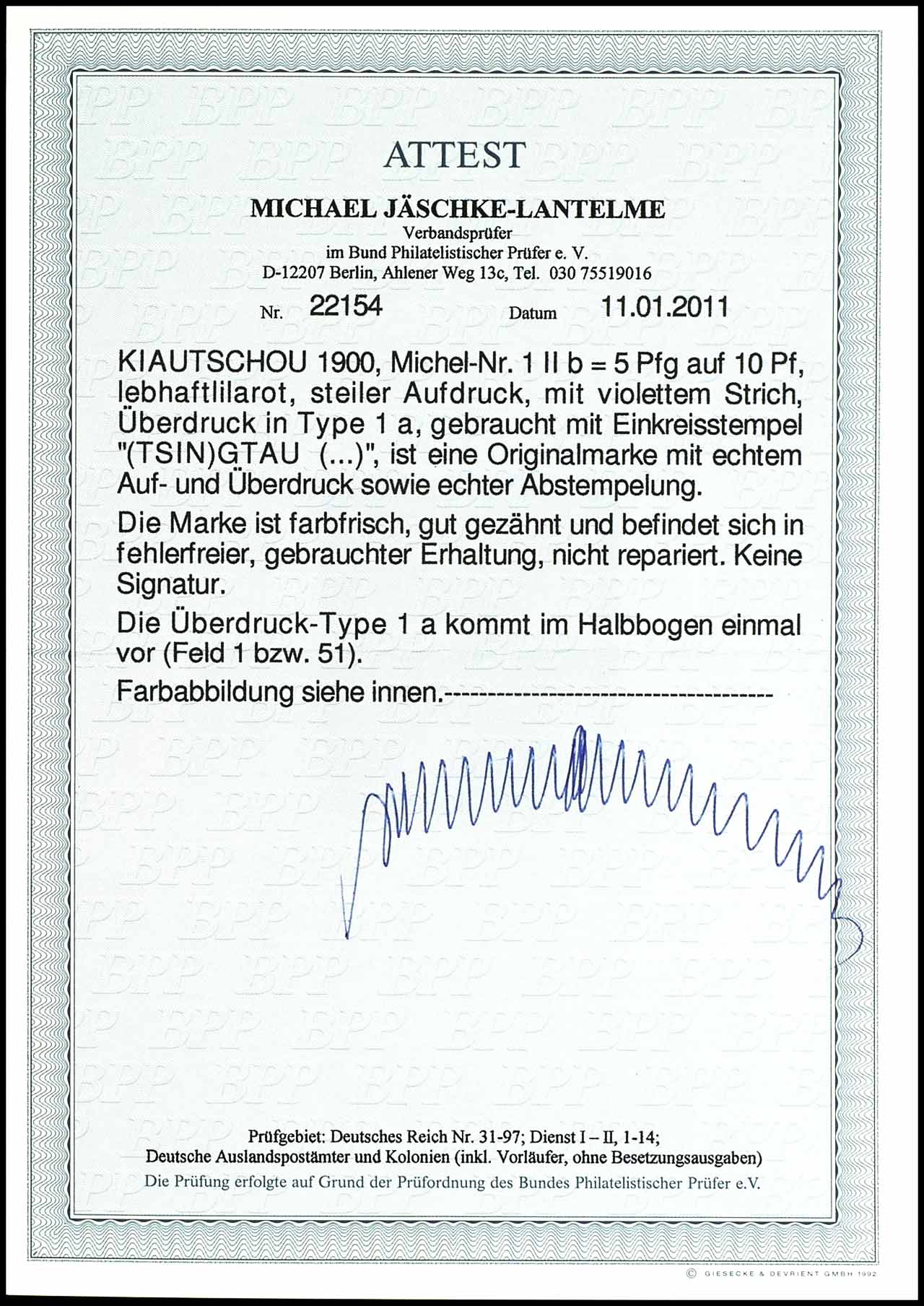 5 Pfg auf 10 Pfennig Krone/Adler mit steilem Bdr.-Aufdruck "China" und violettem Strich, Überdruck in Type 1a - nur einmal im Halbbogen vorkommend (Feld 1 oder 51), entwertet mit Einkreisstempel TSINGTAU, unsigniert, Fotoattest Michael Jäschke-Lantelme BPP "in fehlerfreier, gebrauchter Erhaltung."