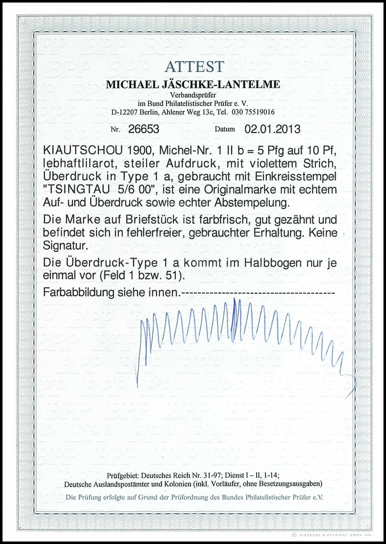 5 Pfg. auf 10 Pfennig Krone/Adler mit steilem Bdr.-Aufdruck "China" und violettem Strich, Überdruck in Type 1a - nur einmal im Halbbogen vorkommend (Feld 1 oder 51), entwertet mit Einkreisstempel TSINGTAU 5/6 00 auf Briefstück, unsigniert, Fotoattest Michael Jäschke-Lantelme BPP "in fehlerfreier, gebrauchter Erhaltung."