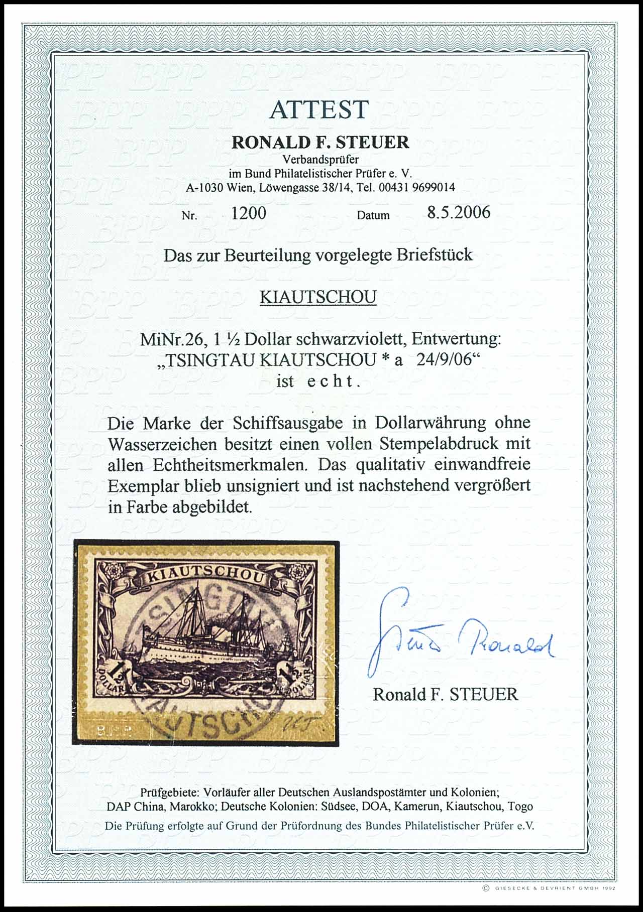1 1/2 Dollar Kaiseryacht, schwarzviolett , ohne Wz., 26:17 Zähnungslöcher, farbfrisch mit nur einem einzigen, zentrisch aufsitzenden Stempel "TSINGTAU KIAUTSCHOU * a 24/9/06", klar abgeschlagen, auf kleinem Briefstück, unsigniert, Fotoattest Ronald F. Steuer BPP (2006) "qualitativ einwandfreies Exemplar", Mi. 2.000.-