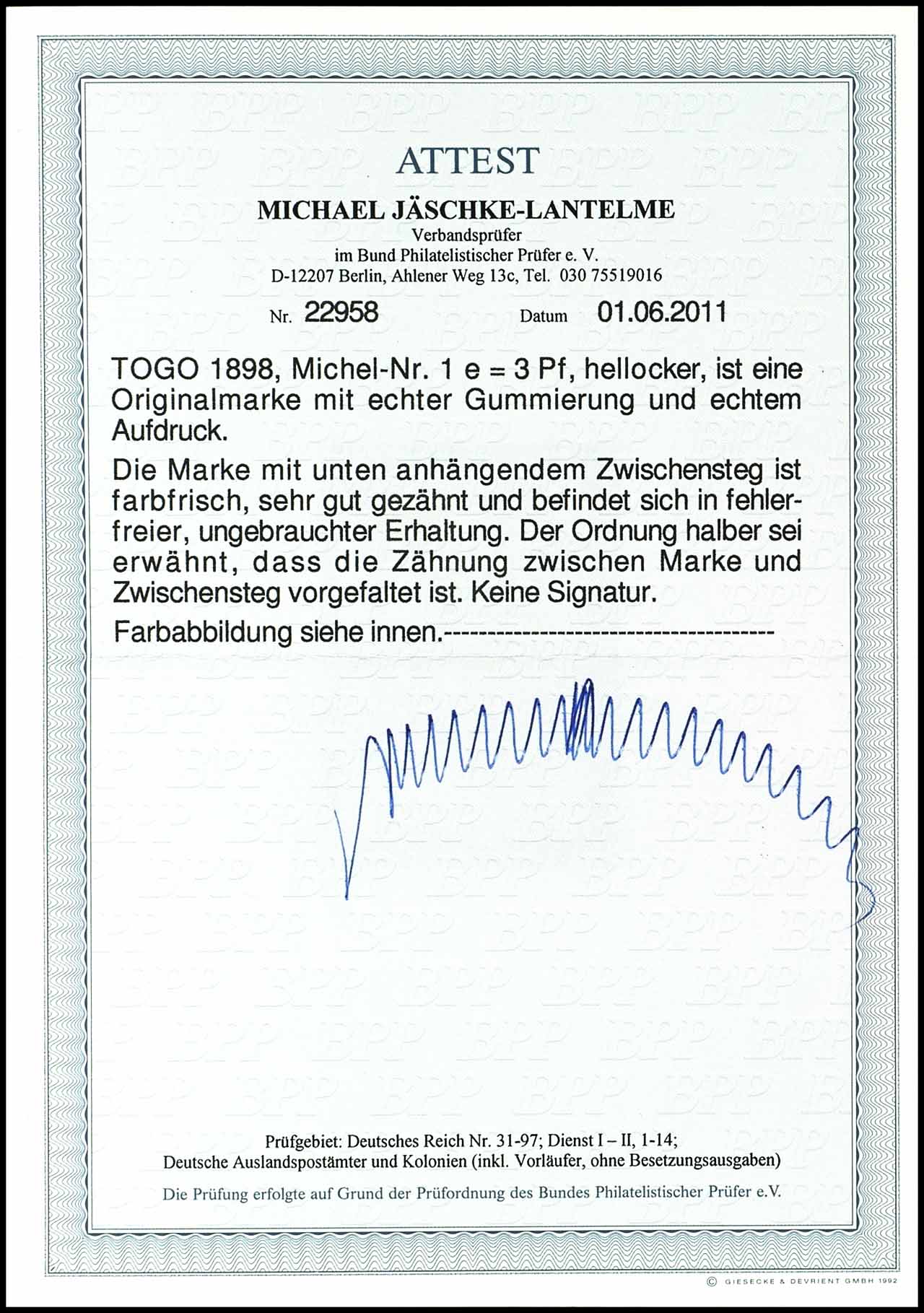 3 Pfennig Krone/Adler, hellocker mit Aufdruck "Togo", ungebraucht, tadellose Erhaltung, vorgefalteter anhängender Zwischensteg, sehr seltene Marke, ohne Signatur, Fotoattest Michael Jäschke-Lantelme BPP, Mi. 700.-