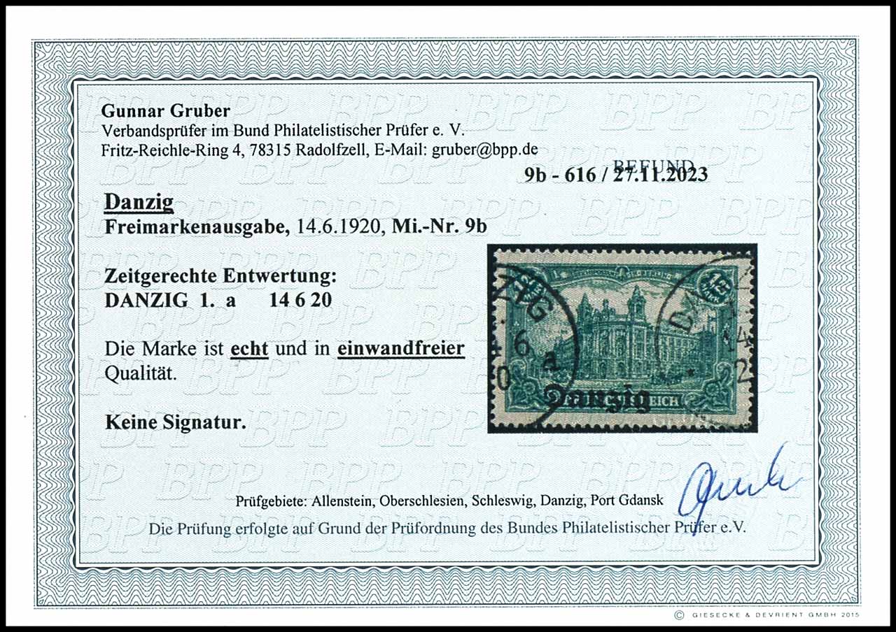1,25 Mark Deutsches Reich mit schwarzem Bdr.-Aufdruck "Danzig", dunkelbläulichgrün, zeitgerecht entwertet mit Einkreisstempel "Danzig * 1a 14 6 20", tadellose Erhaltung, unsigniert, Fotobefund Gunnar Gruber BPP "echt und einwandfrei", Mi. 300.-