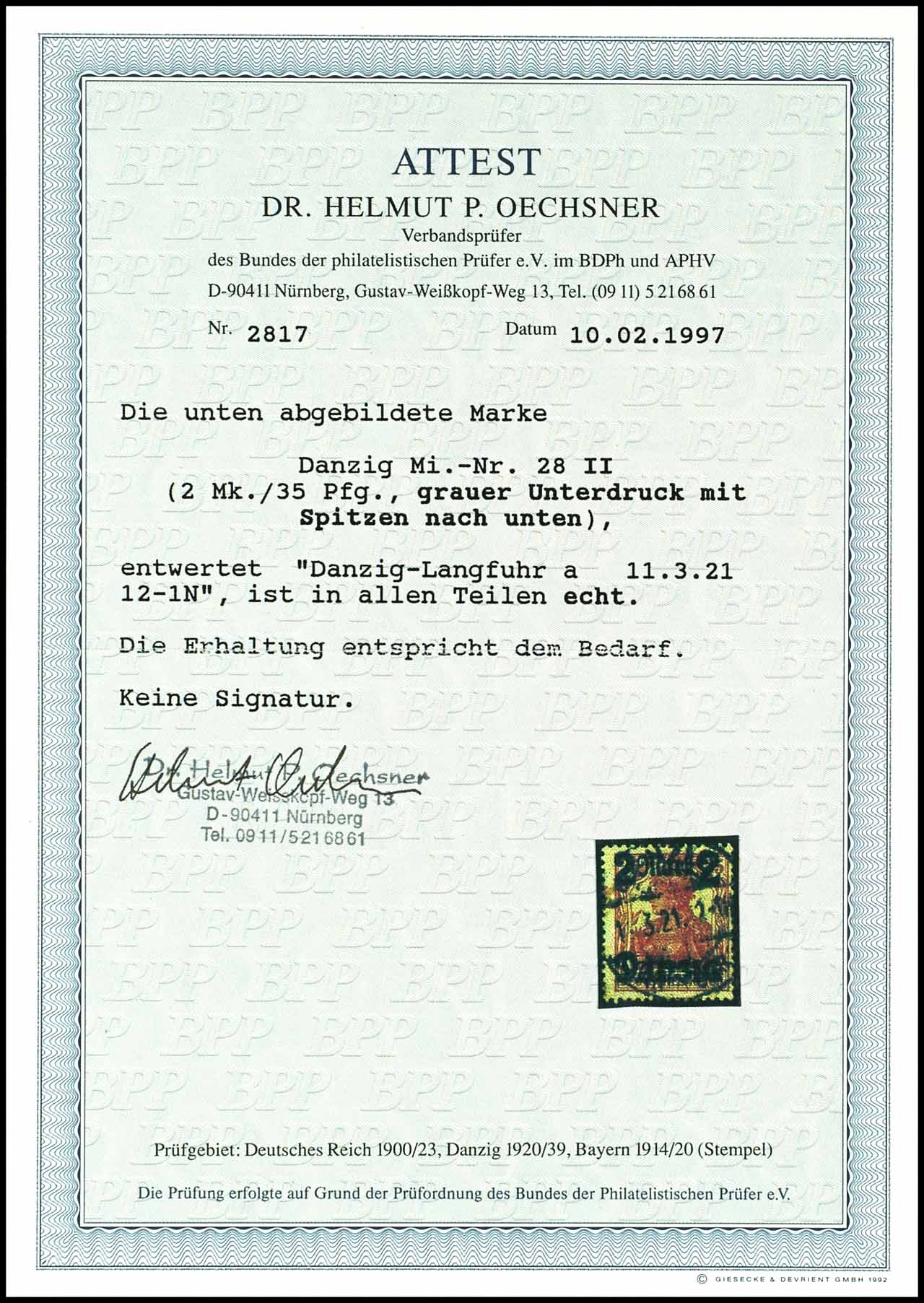 2 Mark auf 35 Pfennig Germania, Netzunterdruck hellgrüngrau, Spitzen nach unten, gestempelt, nicht signiert, Attest Dr. Oechsner BPP , Mi. 700.-