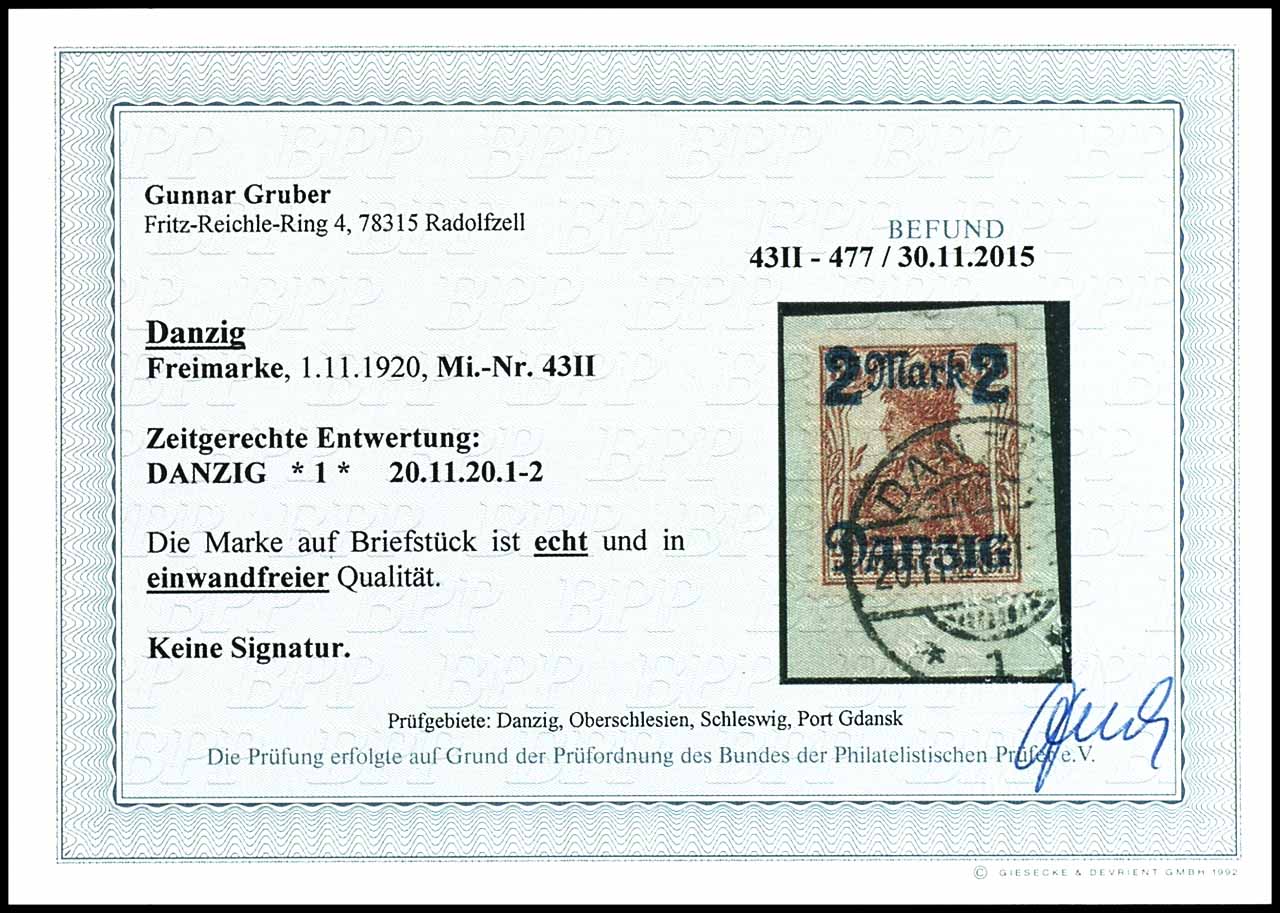 2 Mark auf 35 Pfennig Germania, Netzunterdruck lebhaftlilagrau in Type II (Spitzen nach unten), zeitgerecht entwertet "Danzig * 1 * 20.11.201-2" auf kleinem Briefstück, Fotobefund Gunnar Gruber BPP (2015) "echt und einwandfrei", Mi. 330.-