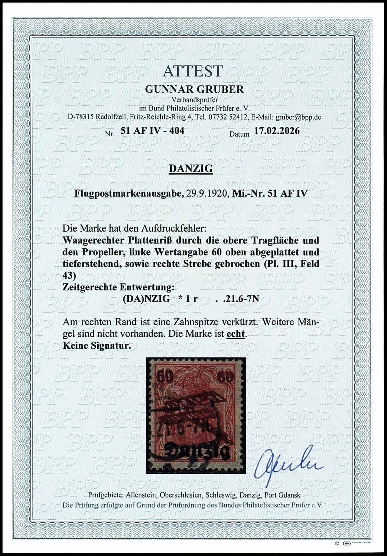 60 Pfennig Flugpostmarke, zeitgerecht gestempelt, kleiner Zahnfehler, Plattenfehler "Plattenriss durch obere Tragfläche...", Fotoattest Gruber BPP