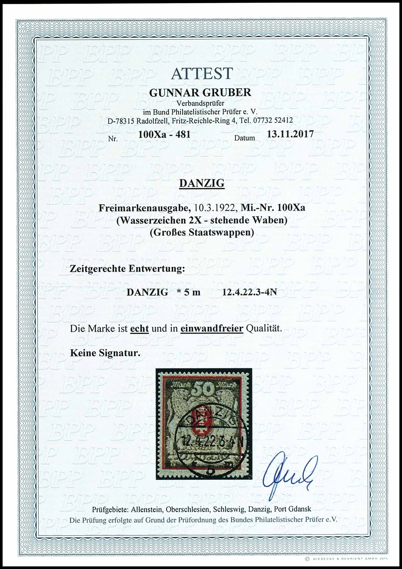 50 Mark Stadtwappen rot/gold mit stehendem Wasserzeichen 2 X, zeitgerecht entwertet "Danzig * 5 m 12.4.22 3-4N", tadellose Erhaltung, unsigniert, Fotoattest Gunnar Gruber BPP "in einwandfreier Qualität.", Mi. 800.-