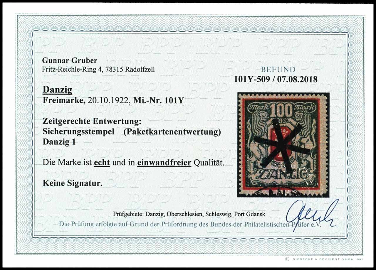 100 Mark "Großes Staatswappen", Wasserzeichen Y, zeitgerecht gestempelt mit Sicherungsstempel (Paketkartenentwertung) vom Postamt Danzig 1, unsigniert, Fotobefund Gruber BPP "echt und einwandfrei", Mi. 350.-